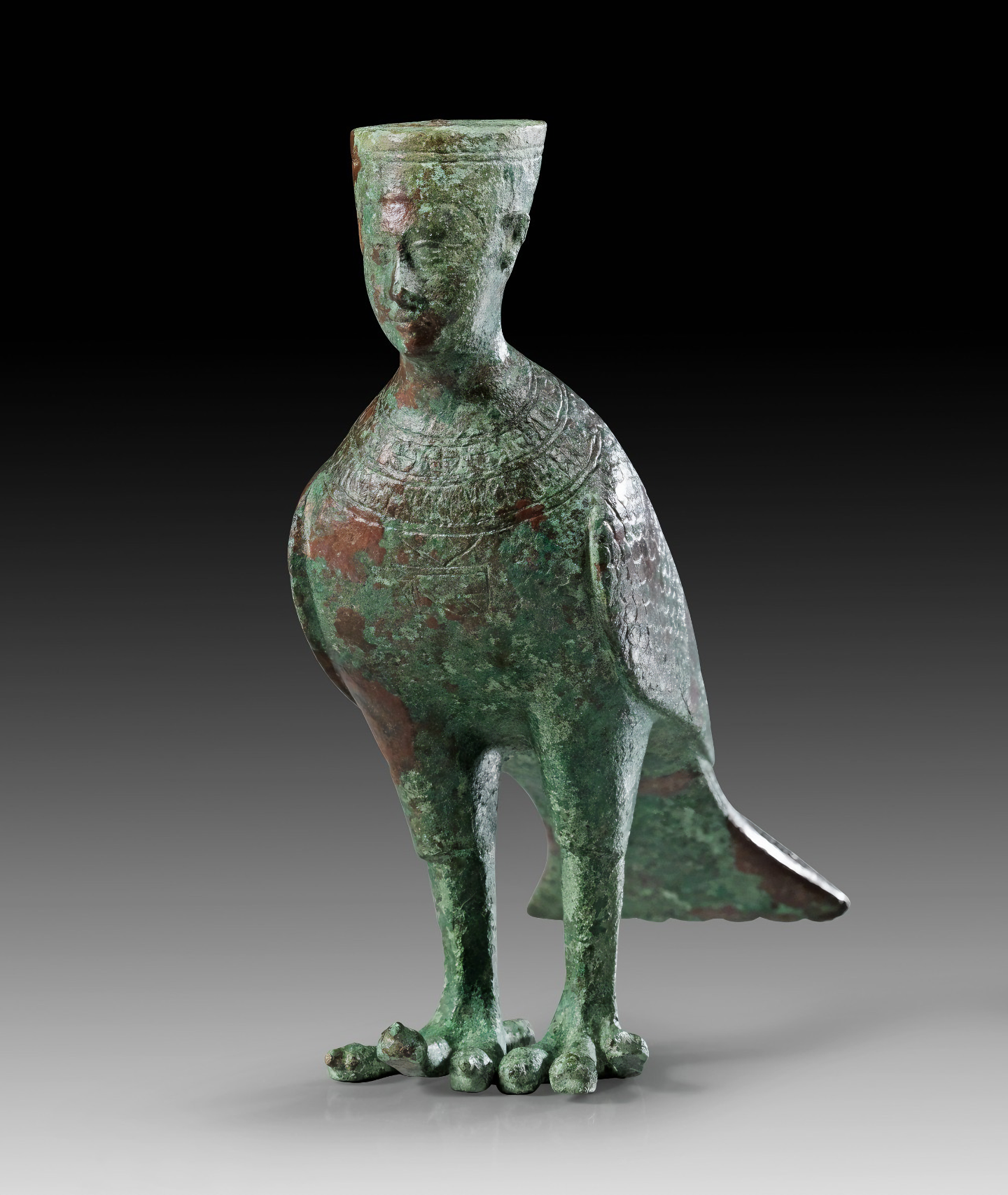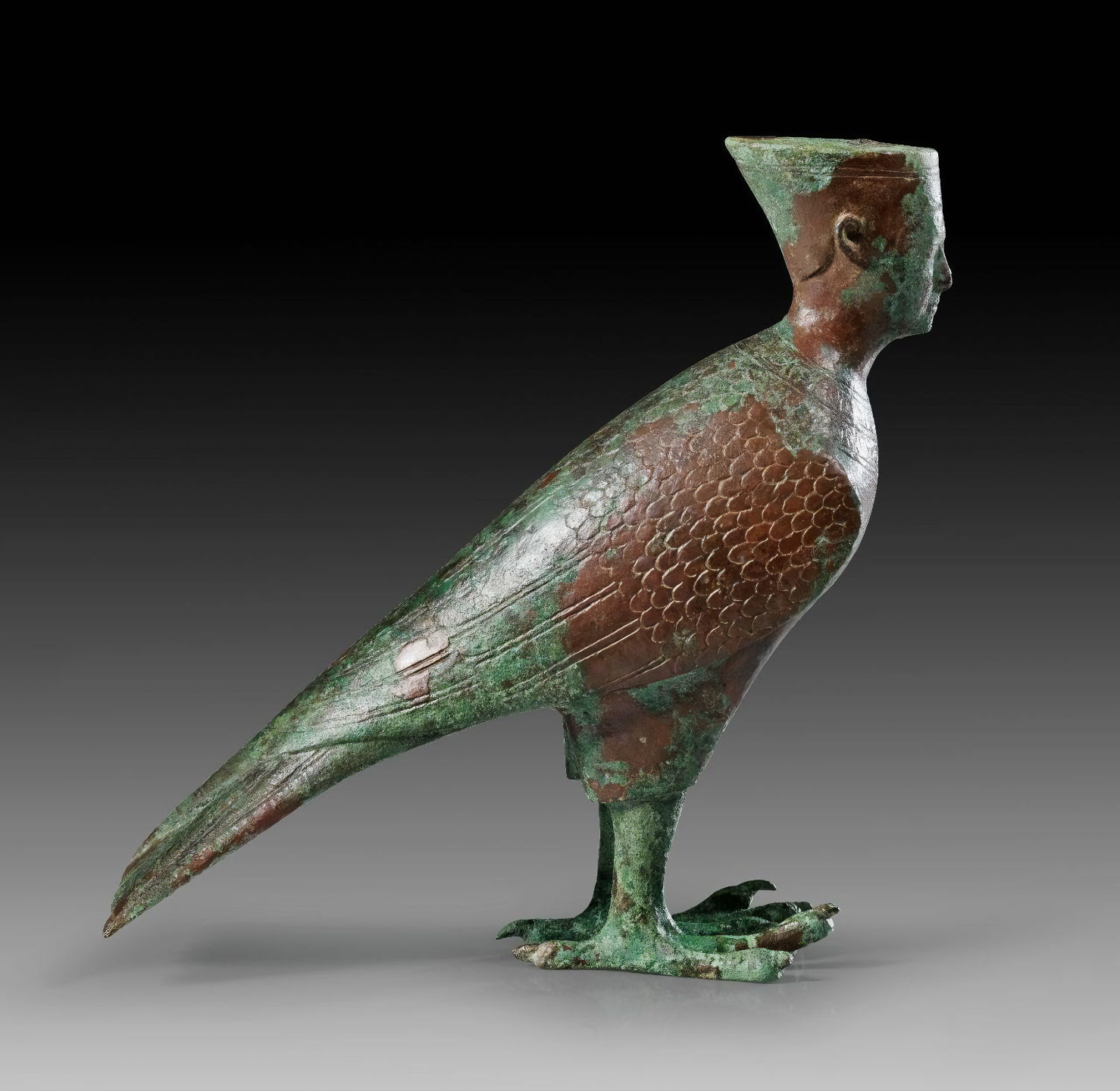 Egyptian Bronze Ba-Bird Figurine, Roman Imperial Period, 2nd Century AD. The falcon body has the human head of a pharaoh.