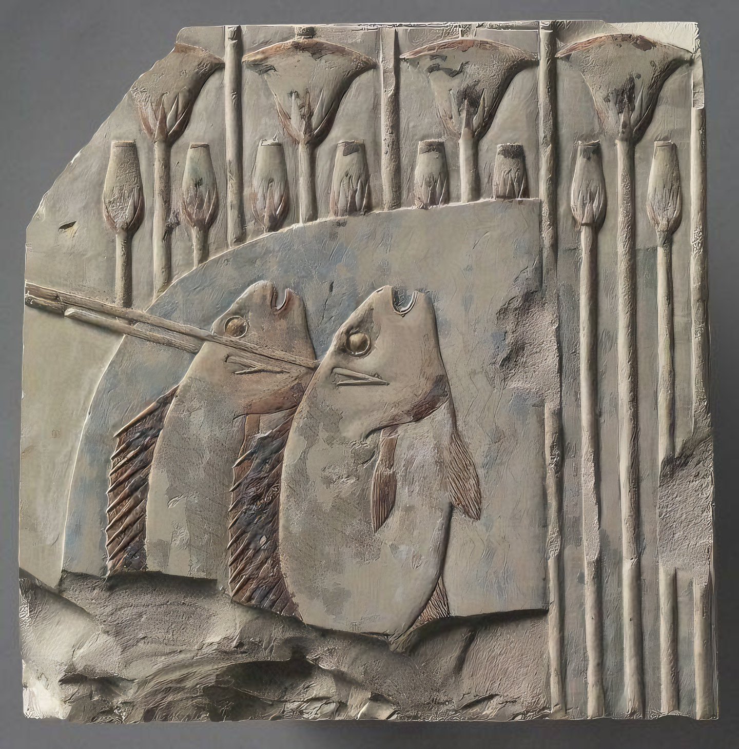 저와 같이 소개하는데 작살을 꽃은 생선을 이미지화한 부조다.