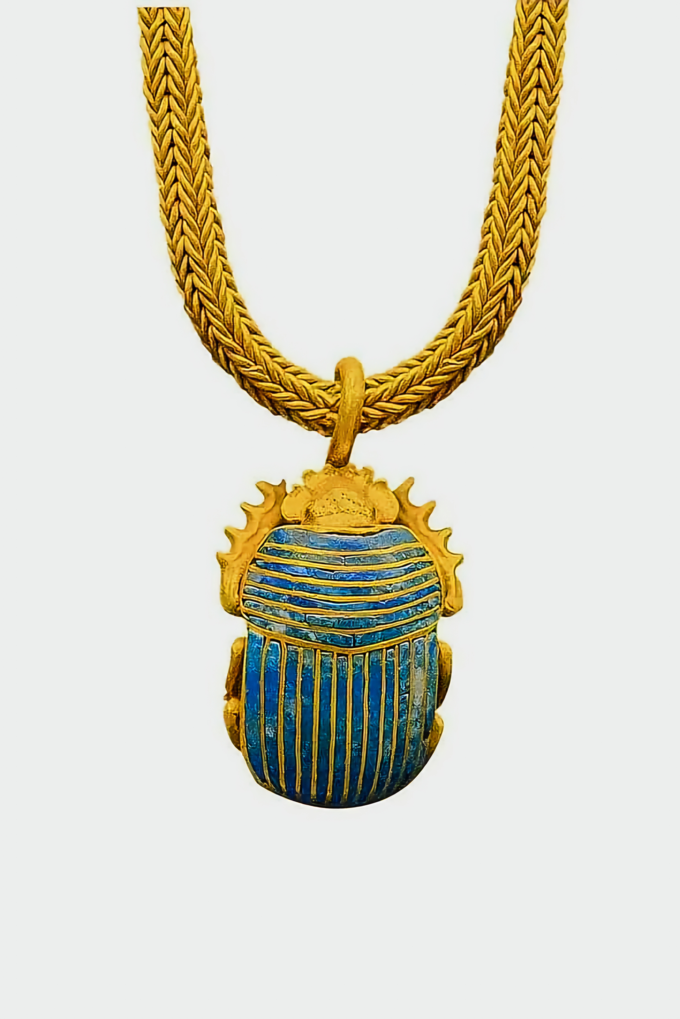 이 펜던트는 라피스 라줄리lapis lazuli 가 상감된 금으로 만들고 두꺼운 체인은 금으로 만들었다.