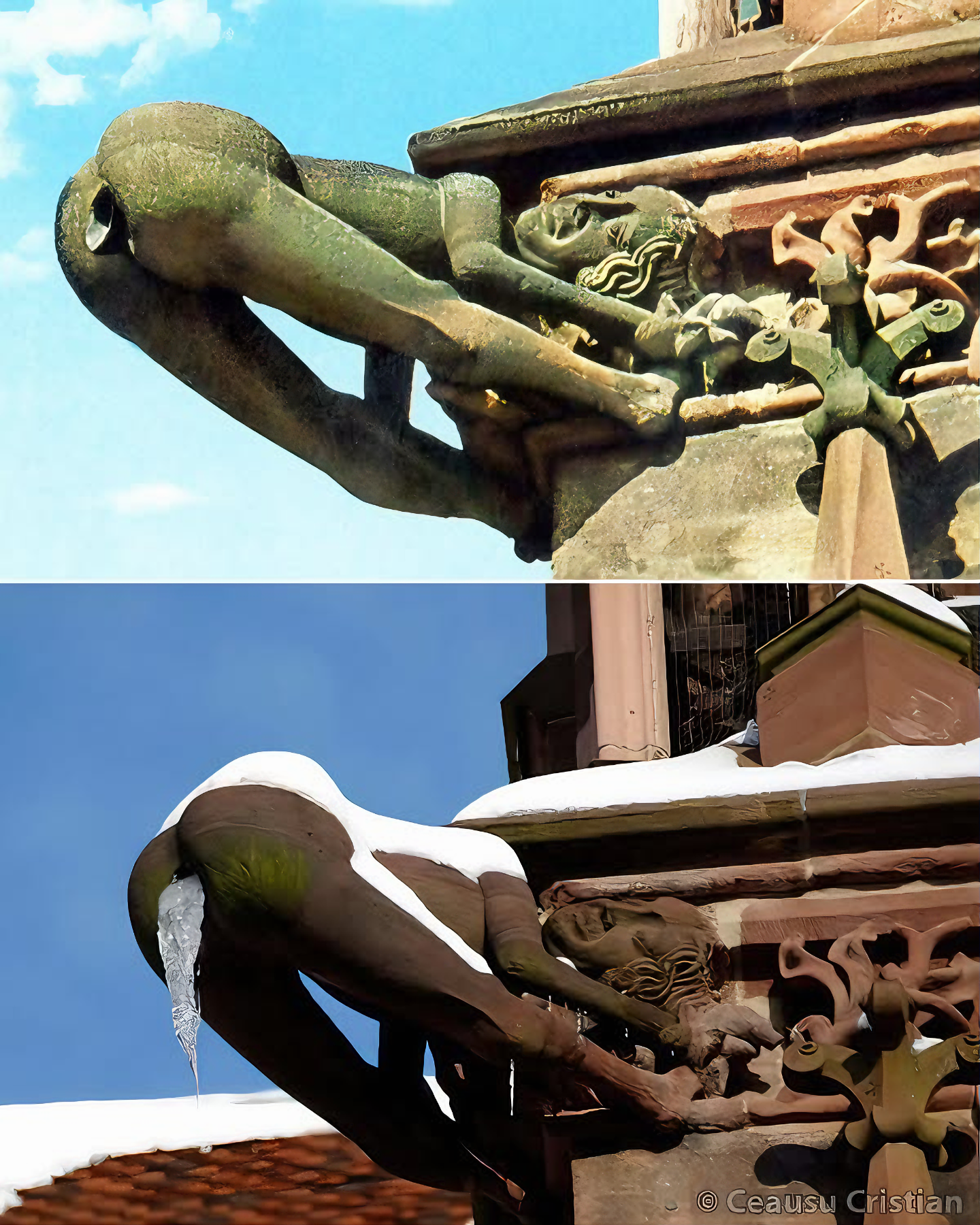 가고일이란 본래 중세 시대에는 신성한 벽에서 비를 흘려보내기 위한 장치였지만, 이 가고일처럼 기발한 디자인을 갖춘 경우도 있다.