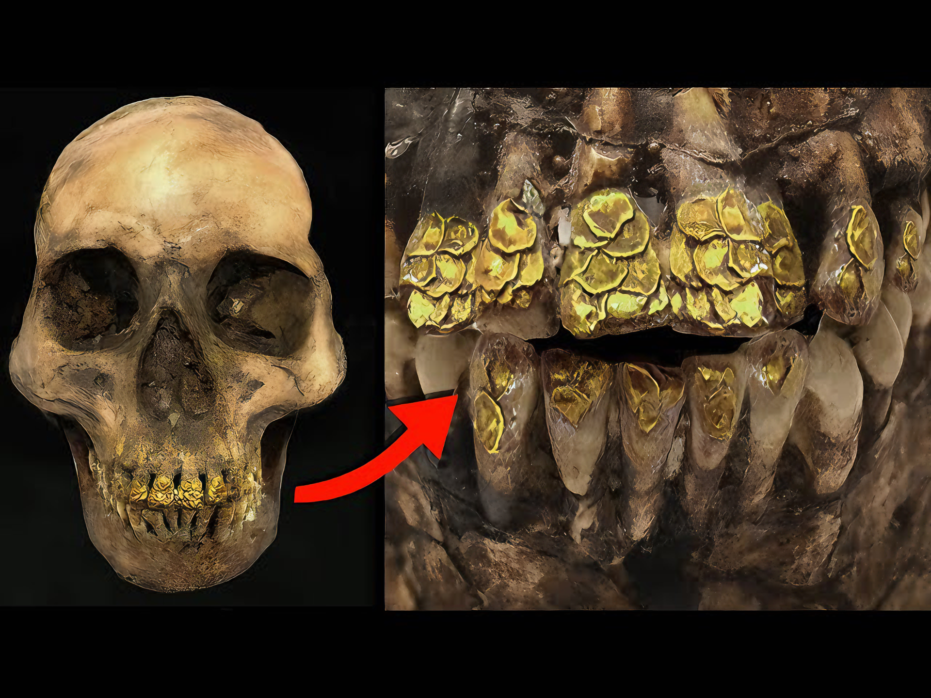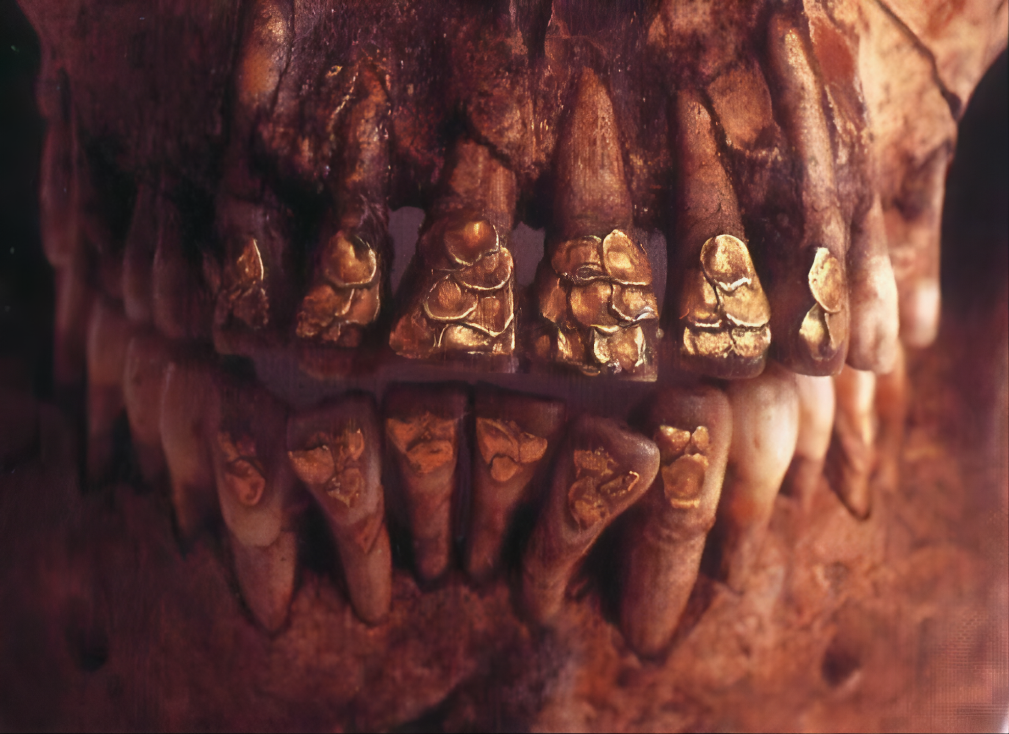 물고기 비늘 모양으로 정교하게 제작한 이 장식은 상악과 하악 앞니, 그리고 송곳니에 부착되었다.