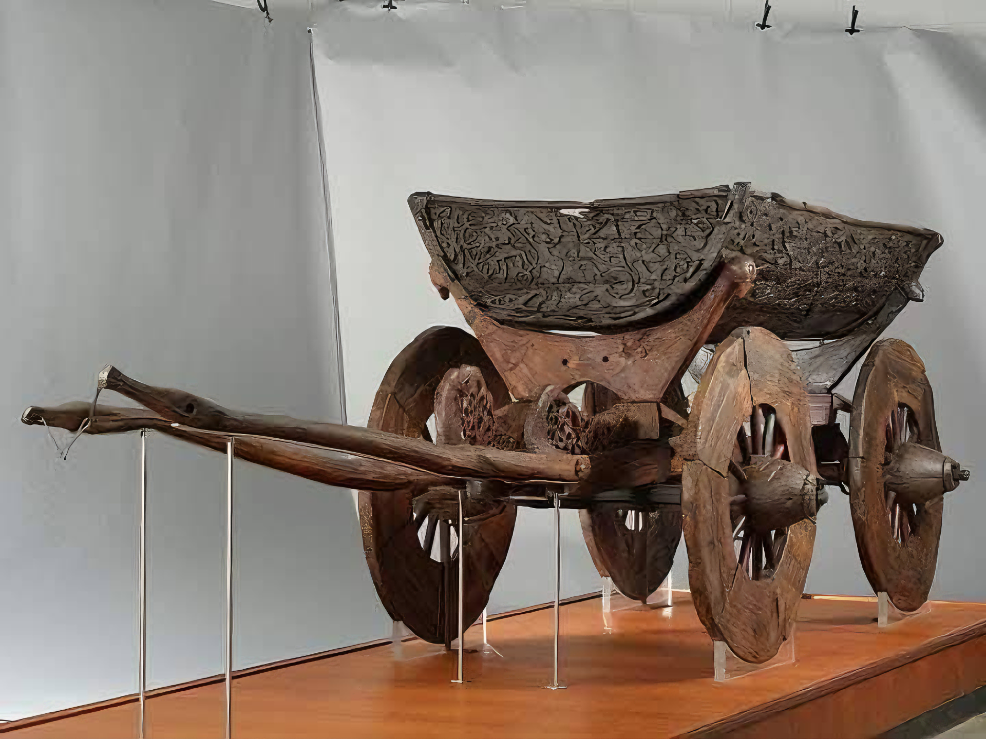 마차: 오세베르그 무덤에서 발견된 다양한 유물 중에는 바로 이 정교하게 제작한 목제 마차가 있다.