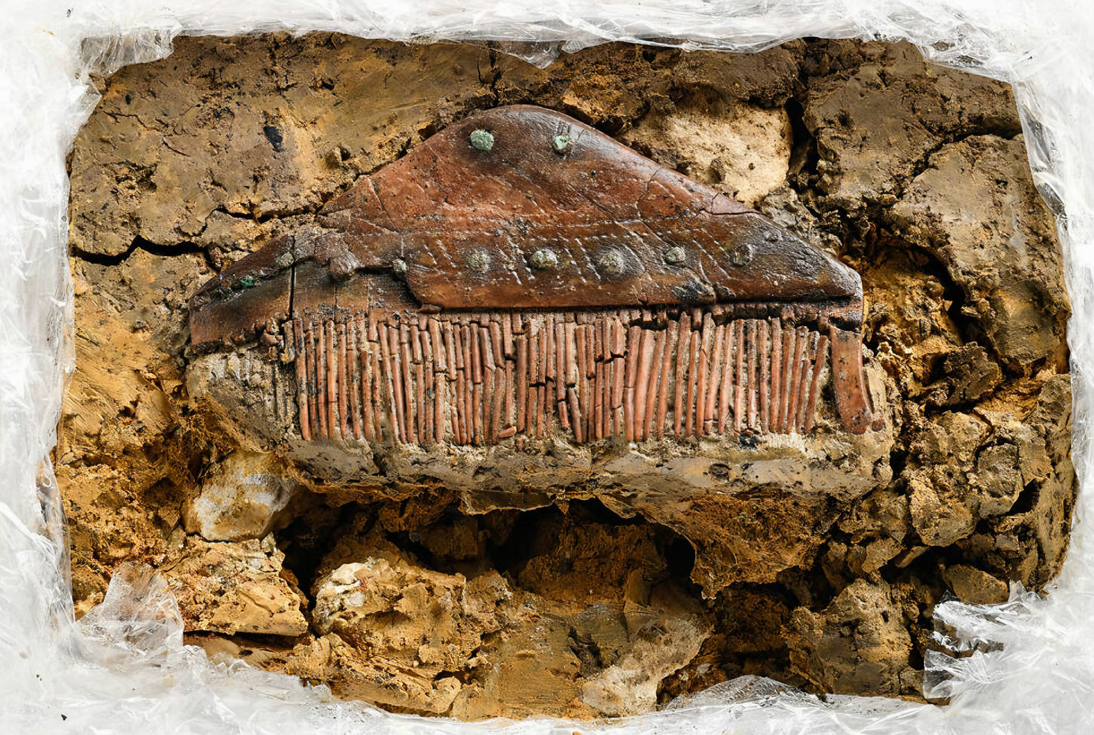 1,700년 동안 무덤 속에 묻힌 채, 섬세하게 조각되고 이빨까지 그대로 남은 작고 정교한 빗이다.