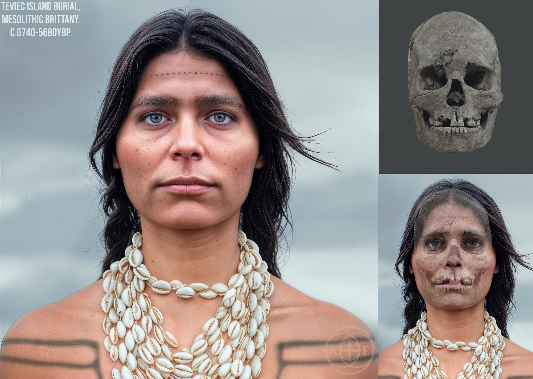 프랑스 브리타뉴 테비에크 섬 매장지에서 발견된 중석기 시대 약 6740-5680년 전, 연령 25~35세 여인 두개골을 복원한 모습이다.