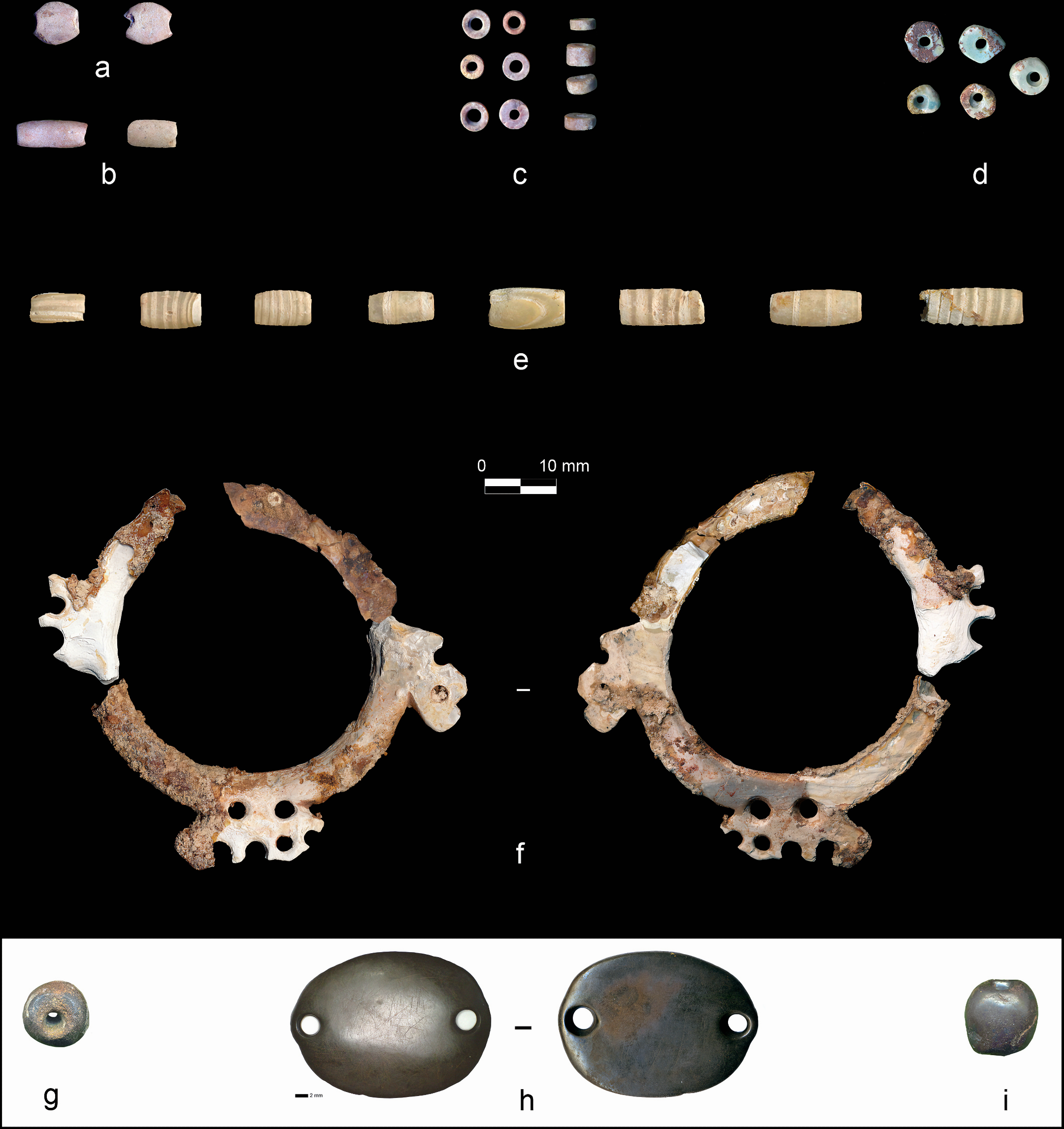 돌과 조개 구슬 stone and shell beads 대략 2천500개, 호박 구슬 2개, 이중 구멍이 있는 돌 펜던트 하나, 그리고 자개 반지 mother-of-pearl ring 하나가 이 무덤에서 발견됐단다.