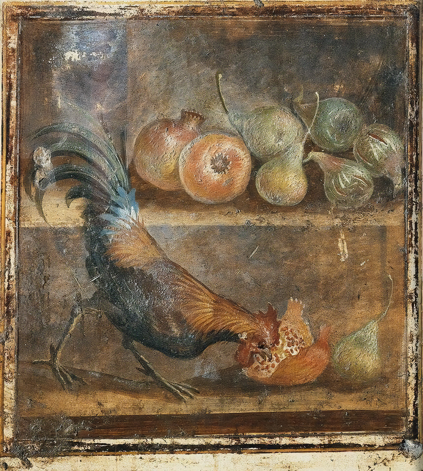 일상 장면을 묘사한 그림이라 과일을 뒤적이는 장닭cockerel을 묘사한다.