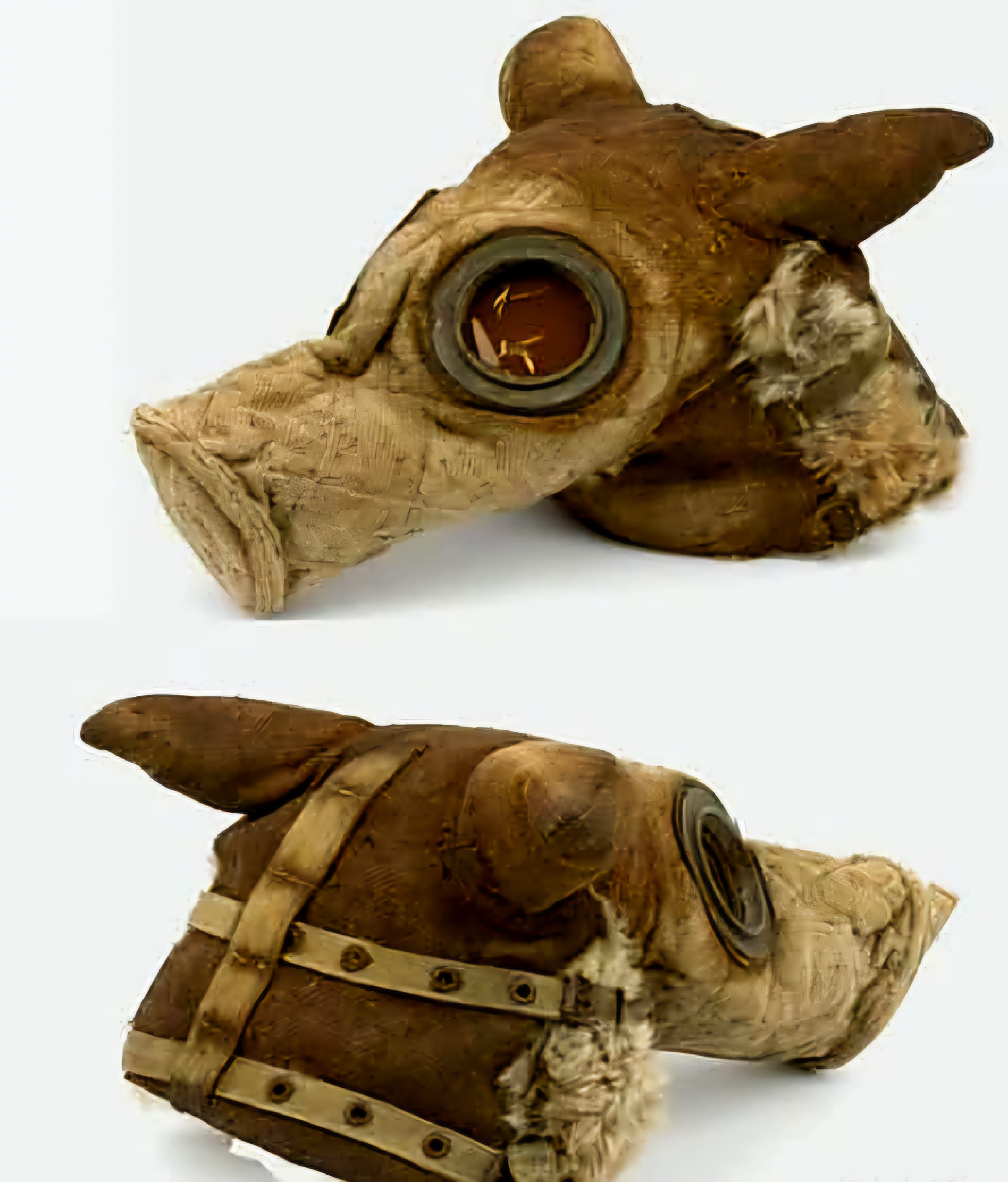 얼굴과 귀를 덮도록 설계된 마스크는 유독 가스를 차단하기 위해 특수 처리된 직물을 사용했다.
