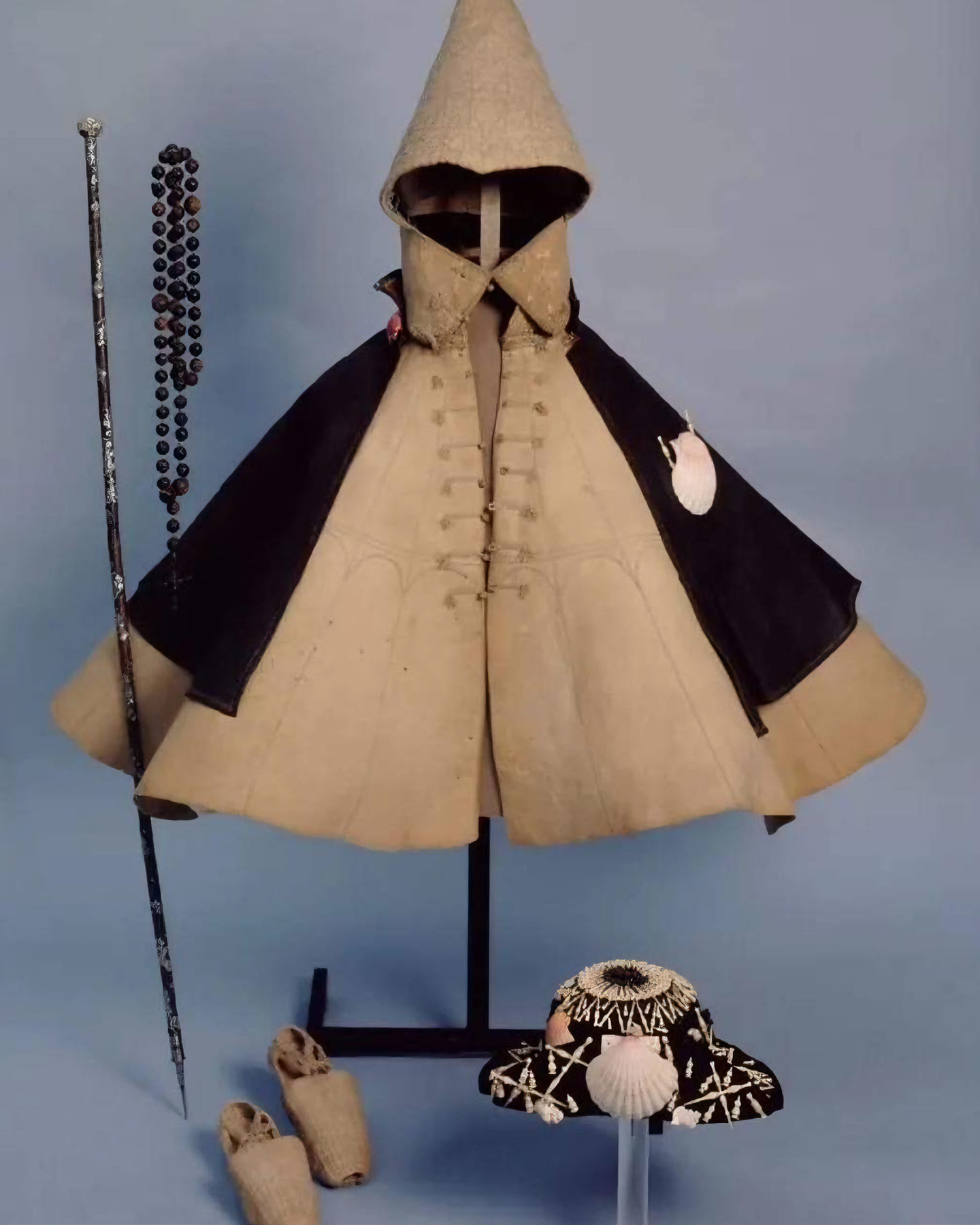 16세기 순례복 Pilgrim Costume이라 방수 코트, 모직 코트, 모자, 지팡이, 묵주로 구성된다.