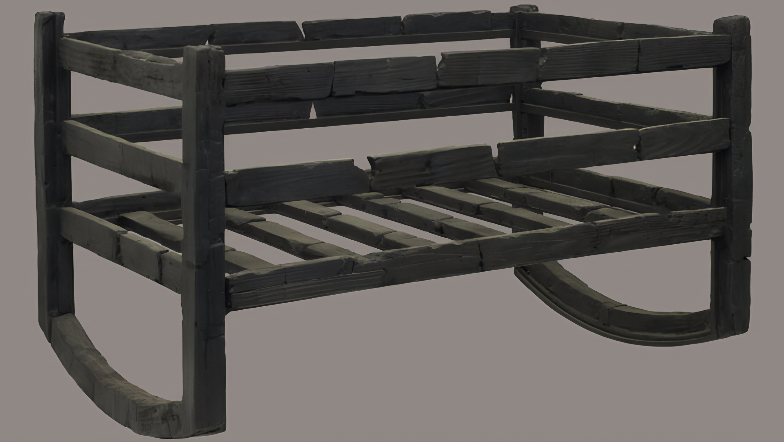 Roman carbonised wooden furniture from Herculaneum, which was buried by the eruption of Mt. Vesuvius in 79 CE. Among them a cradle discovered with the remains of a small baby wrapped in blankets still inside it, a stool, a table and a little night stand
