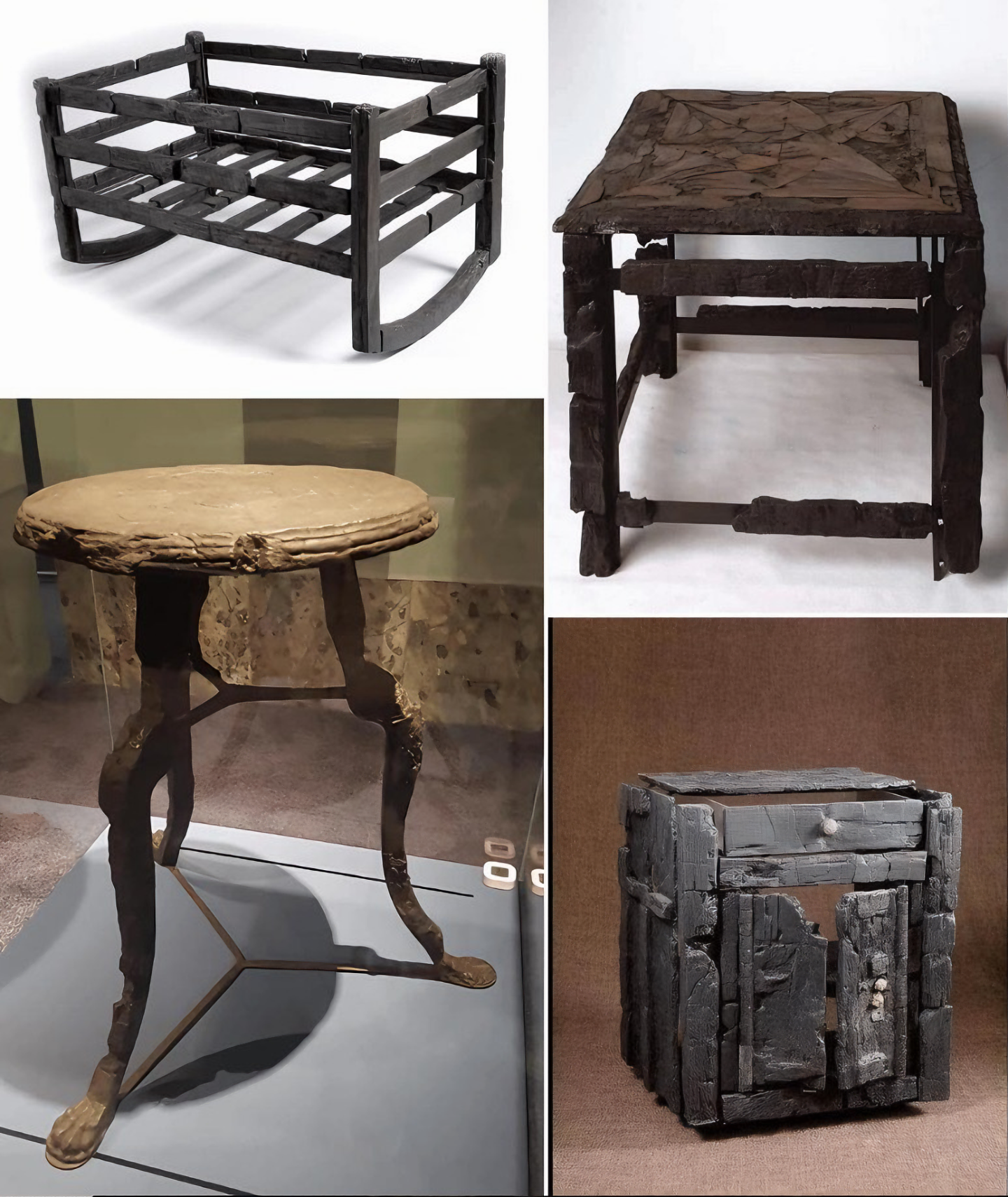 Roman carbonised wooden furniture from Herculaneum, which was buried by the eruption of Mt. Vesuvius in 79 CE. Among them a cradle discovered with the remains of a small baby wrapped in blankets still inside it, a stool, a table and a little night stand