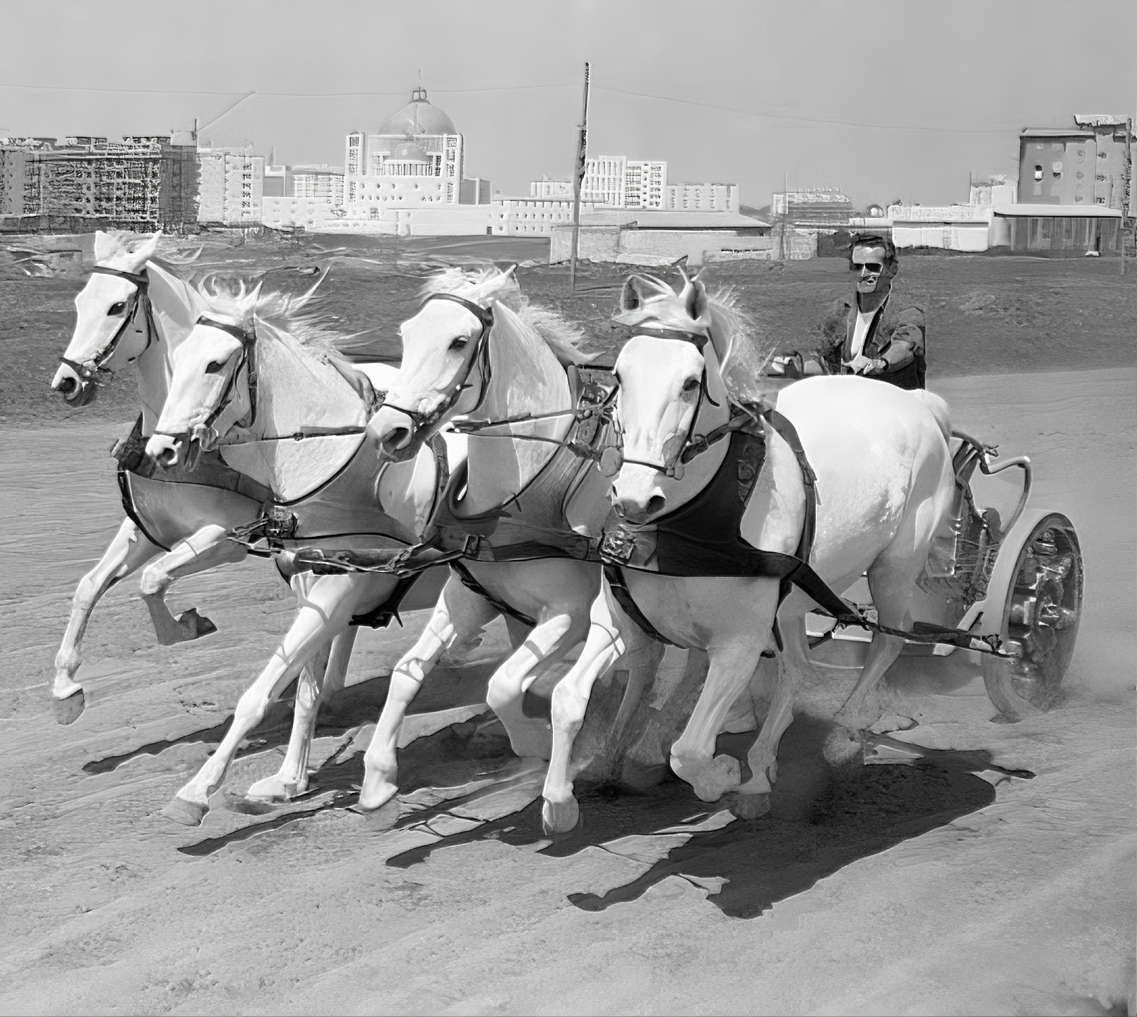 찰튼 헤스턴Charlton Heston은 영화 벤 허 Ben Hur를 준비하면서 로마에서 4마리 말이 모는 전차를 타고 연습하는 장면이다.