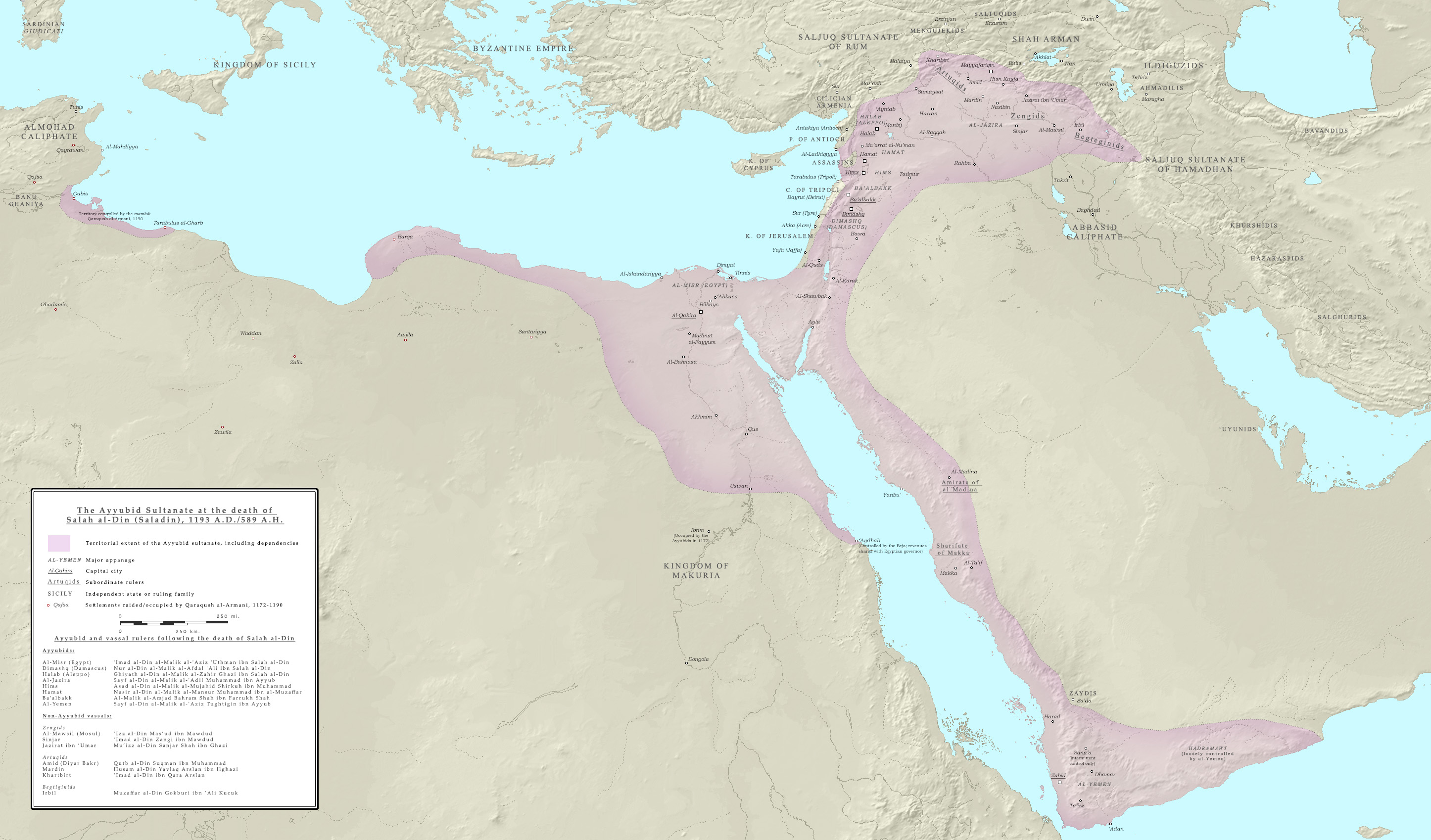 그의 전성기 그는 이집트, 시리아, 예멘, 이라크, 메카, 헤자즈 등지를 아우르는 아이유브 왕조Ayyubid dynasty를 세웠다.