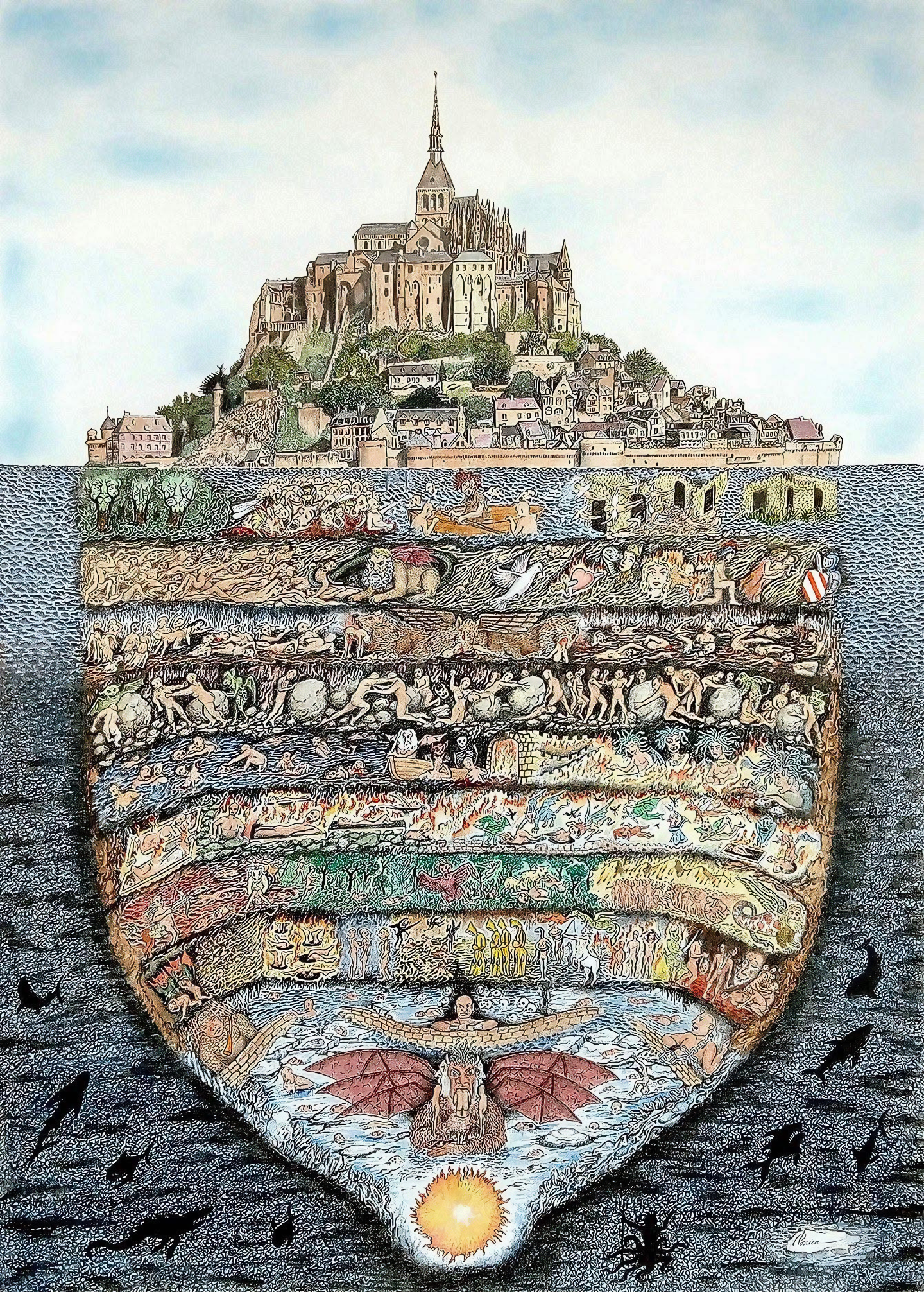 피에르 이오니카 Pierre Ionica의 책 《몽생미셸 아래의 단테의 지옥Dante’s Hell under Mont Saint Michel》은 단테 알리기에리Dante Alighieri가 몽생미셸Mont Saint-Michel의 건축 구조에서 지옥 묘사의 영감을 얻었을 것이라는 흥미로운 가설을 제시한다.