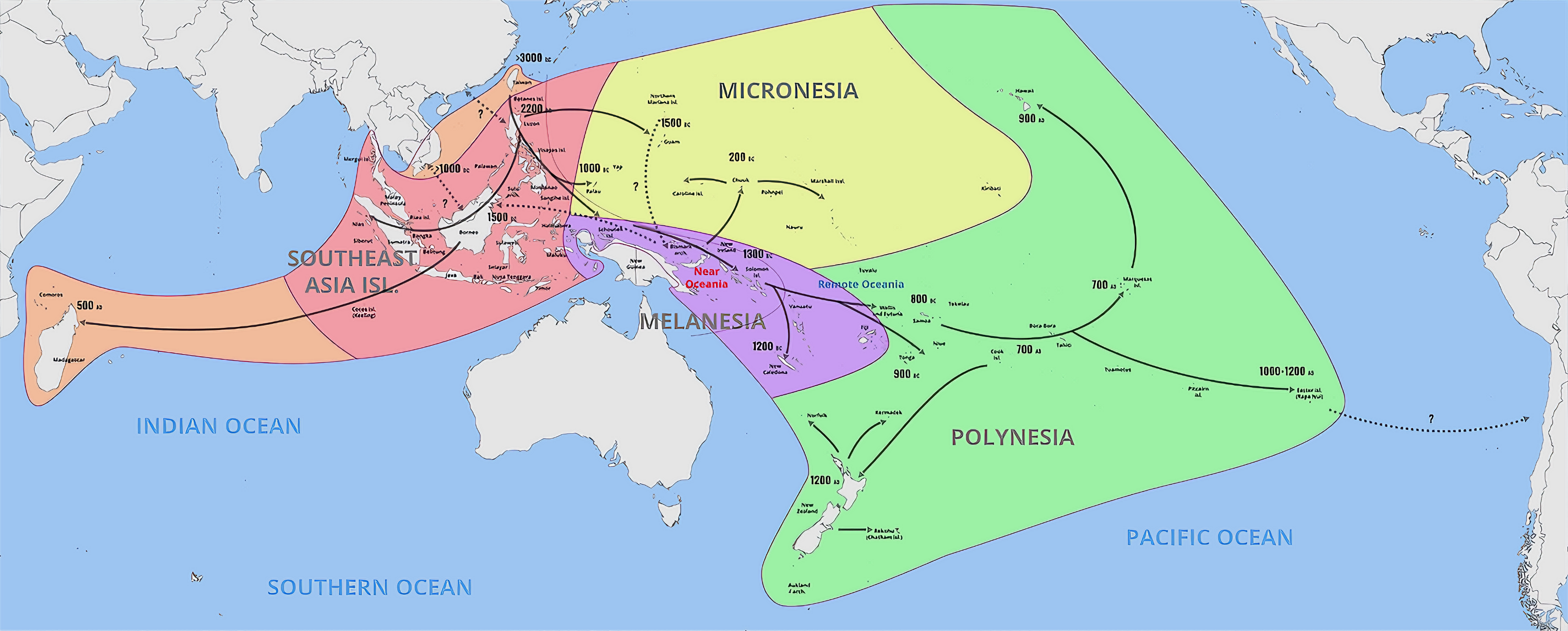 2011년 피터 벨우드Peter Bellwood는 말레이폴리네시아어 화자들Malayo-Polynesian speakers이 오세아니아로 처음 이동한 것은 북부 필리핀에서 동쪽으로 마리아나 제도로, 그 후 남쪽으로 비스마르크 제도로 이동한 것이라고 주장했다.