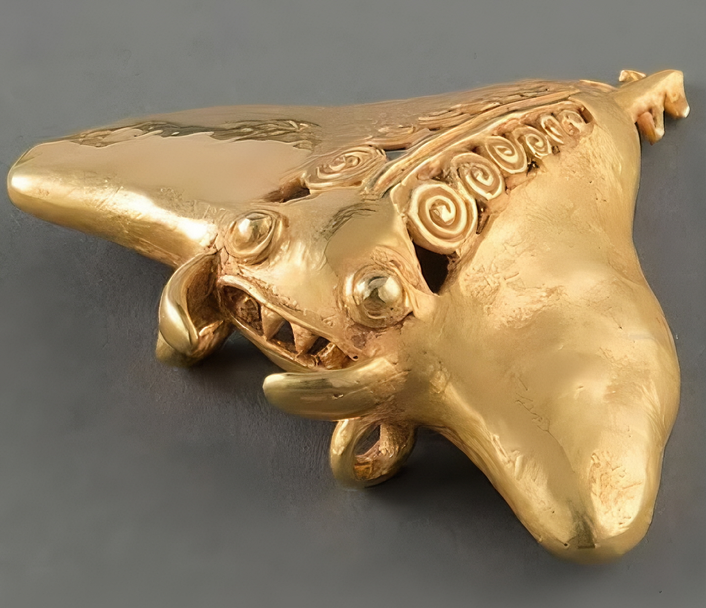 서기 700년에서 1100년 사이에 제작된 이 아름다운 금빛 가오리 펜던트는 코스타리카 디키스 문화Diquis culture에서 비롯한다.