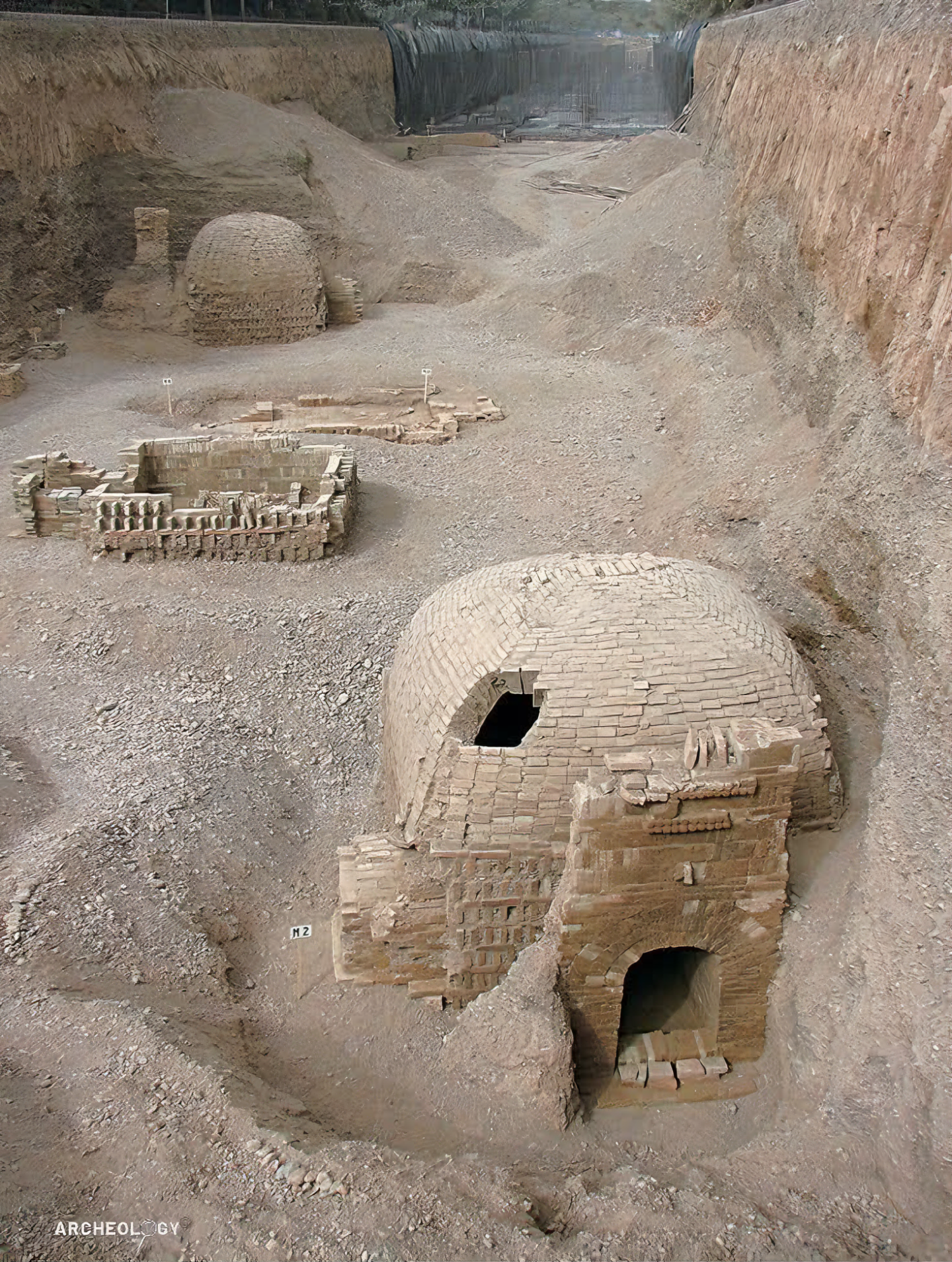 곡선형 벽돌 구조는 흙과 잔해 아래에서 수천 년을 견뎌낸 견고한 돔형 방을 형성한다.