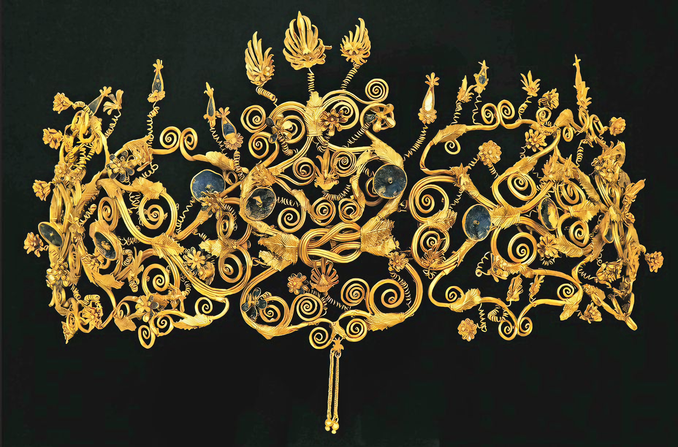 Crown from the tomb of Philip II of Macedon (382–336 BC) and the Thracian princess Meda of Odessa (died 336 BC) at Aegae, Macedonia.