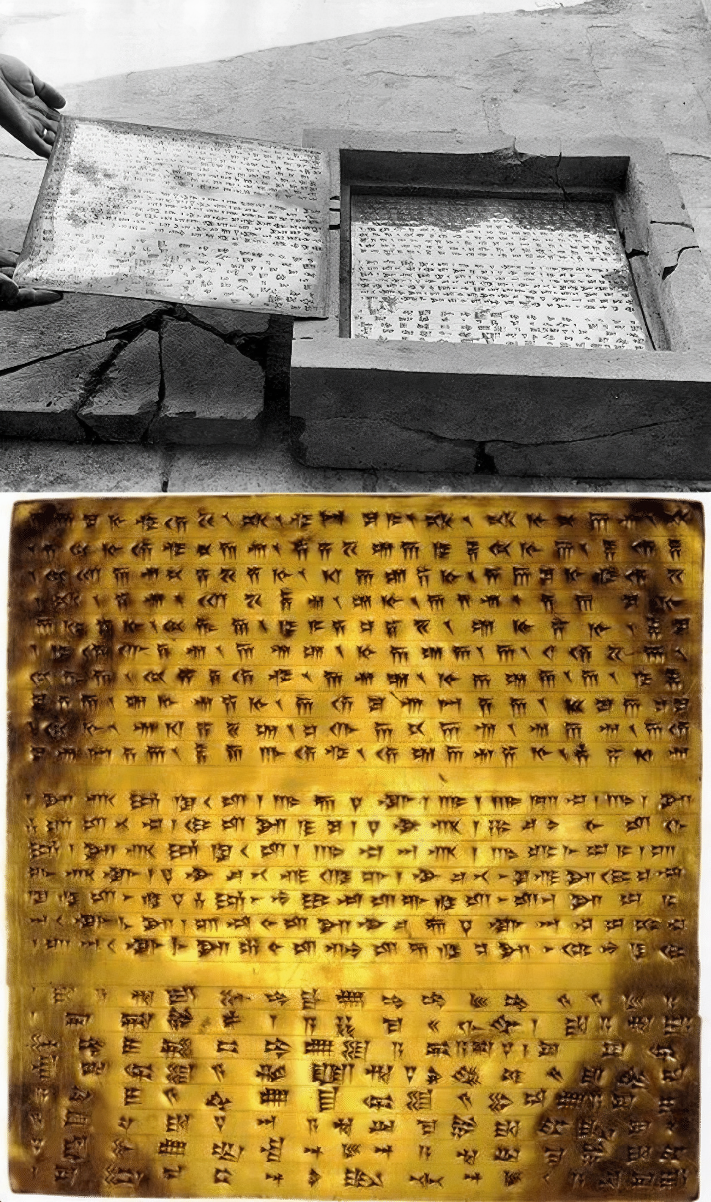 The gold and silver foundation tablets of the Apadana Palace in Persepolis. Found in stone boxes in 1933, they contain a trilingual inscription by Darius I (r. 522-486 BCE) in Old Persian, Elamite and Akkadian, which describes his Empire in broad geographical terms