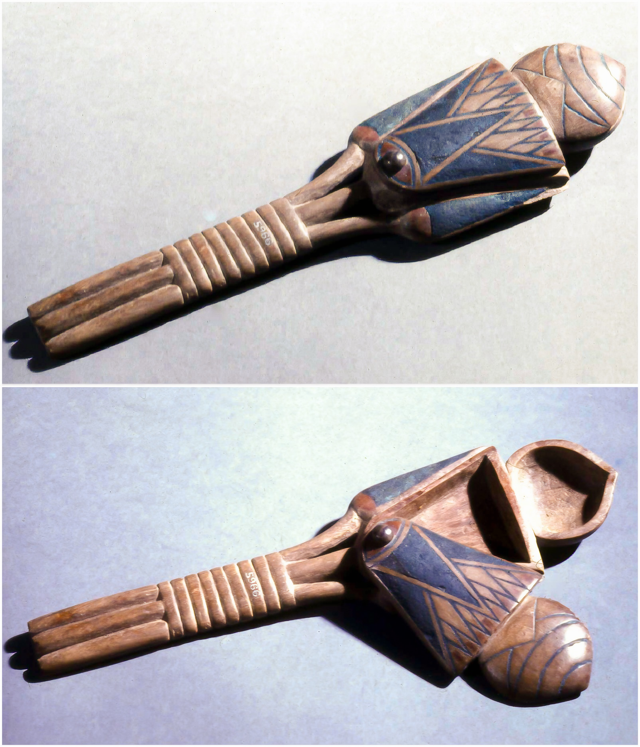 기원전 1350년 무렵 제18왕조 후반에 제작된 정교하게 제작된 이 나무 연고 숟가락은 미적 우아함과 상징적인 풍요로움을 동시에 자아낸다.