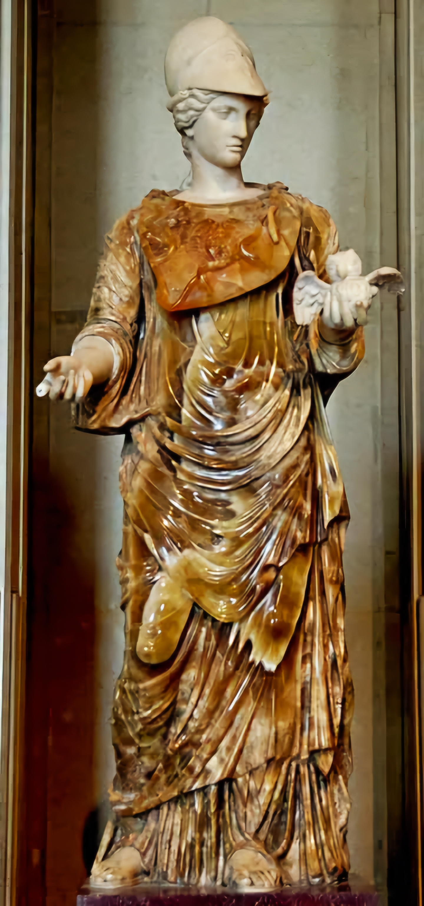 Helmeted Minerva holding a tiny owl.