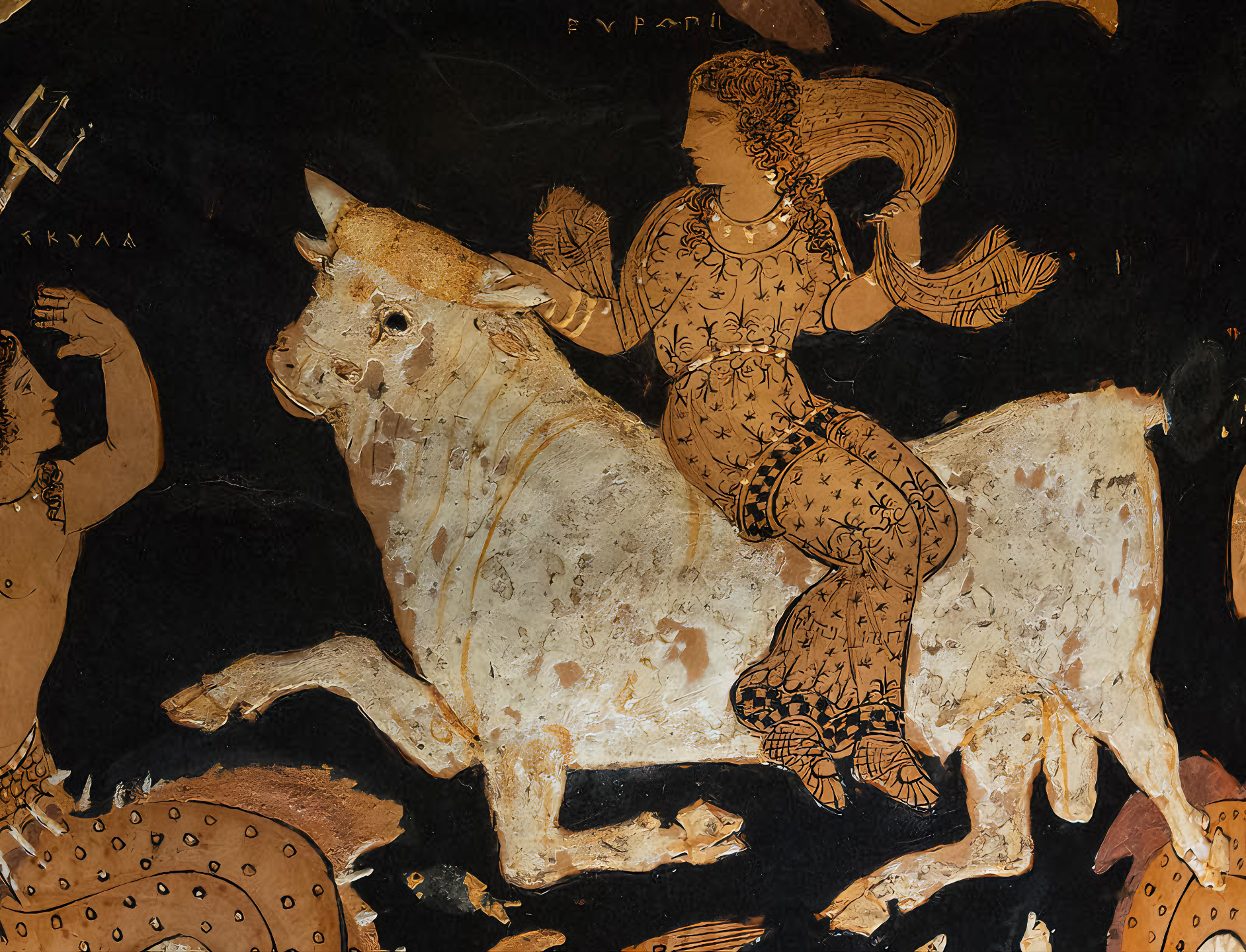 기원전 350-340년 무렵 제작된 파에스툼Paestum 출토 붉은색 형상 칼릭스크타테르red figured calyx-krater에서 보이는 한 장면이라, 에우로파Europa가 하얀 황소로 변한 제우스를 올라탄 모습을 묘사한다.