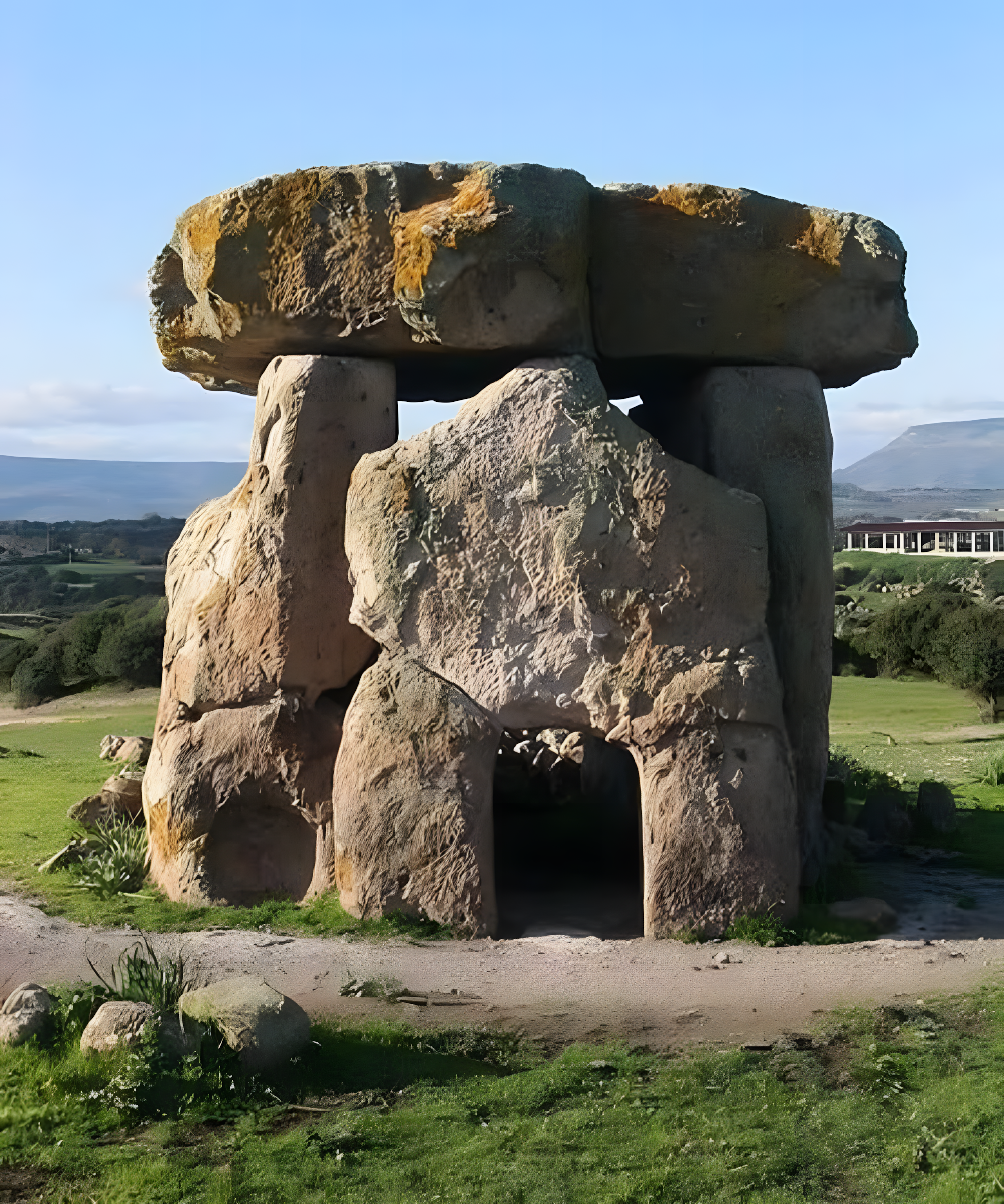 이 기념물들은 무거운 수평 슬라브slab와 그것을 지탱하는 거대한 수직 돌들로 이루어져 있으며, 장례실로 이어지는 입구가 있는 기념비적인 정면을 형성한다.