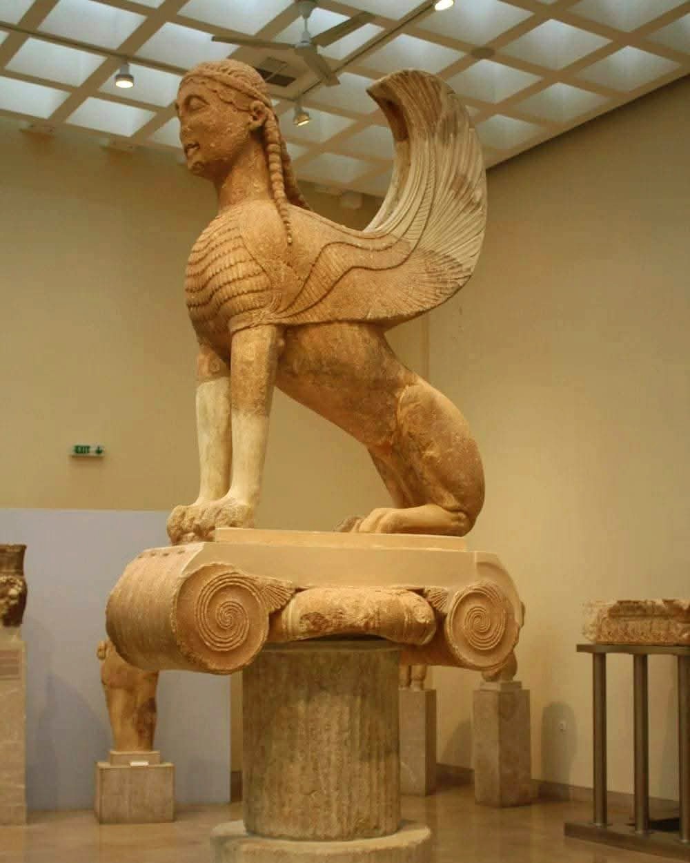 델포이 고고학 박물관에 자리잡은 이 신화 속 생물은 여자 머리, 장엄한 새 날개, 강력한 암사자 몸을 지니니