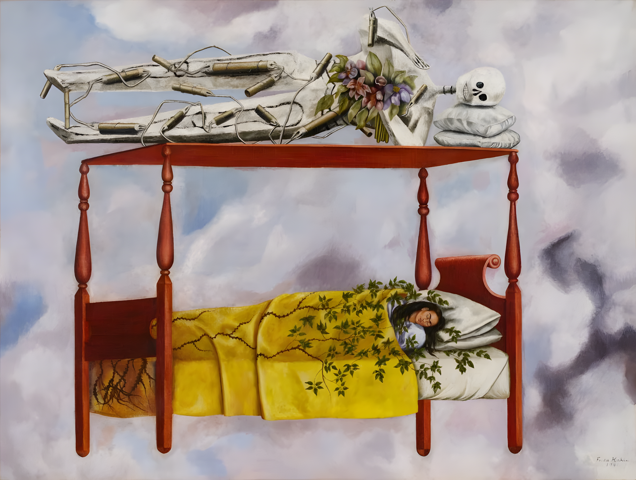칼로의 1940년작 엘 수에뇨El sueño(La cama)는 재생을 상징하는 덩굴에 싸인 채 하늘에 떠 있는 네 기둥 침대에 누운 작가 모습을 보여준다.