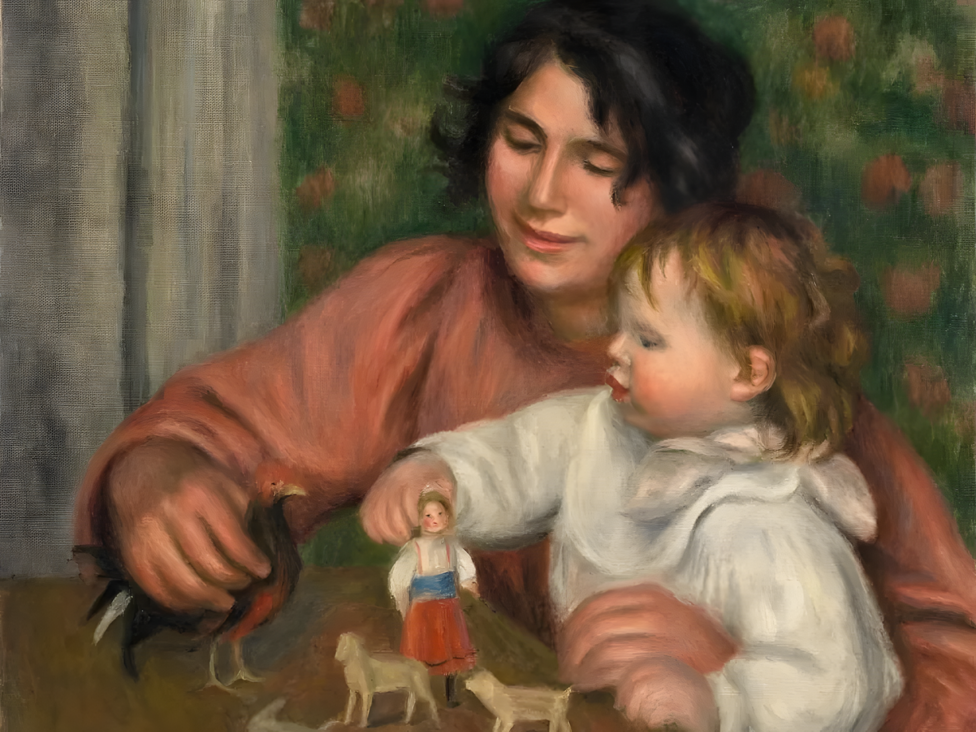 <아이와 장난감들 – 가브리엘과 아들의 화가 장>(L’enfant et ses jouets – Gabrielle et le files de l’artiste, Jean)이라는 제목 이 그림은 르누아르Renoir’s 어린 아들 장Jean 이 유모 가브리엘Gabrielle과 노는 모습을 묘사하며, 그 장면은 생생하게 따뜻한 감동을 선사한다.