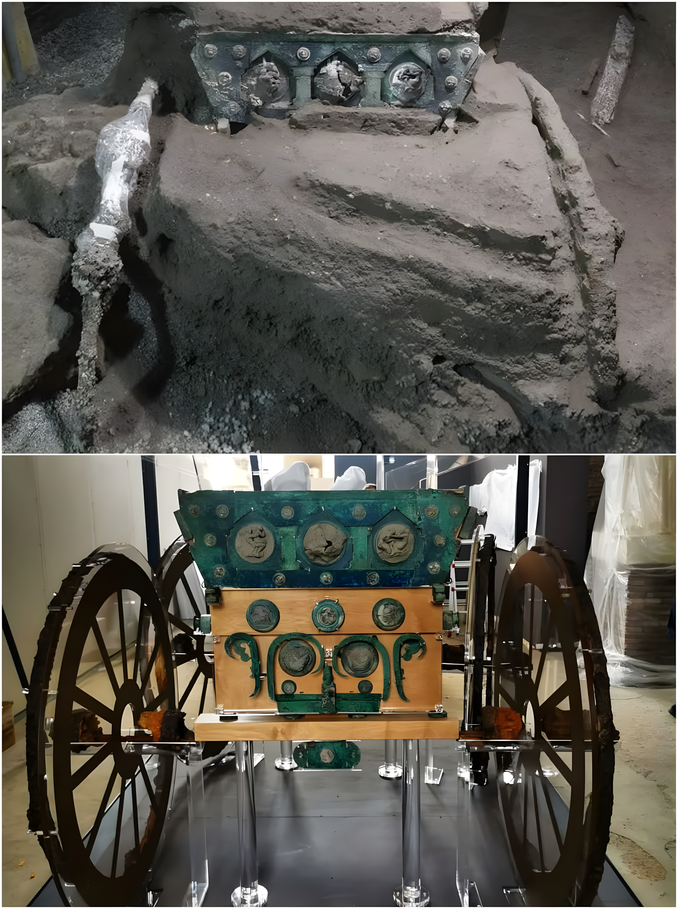 서기 79년 베수비오 화산 대분화 이후 화산재 아래 온전히 묻혀 있던 이 정교한 전차는 화려한 행렬에 사용되었을 것으로 추정한다.