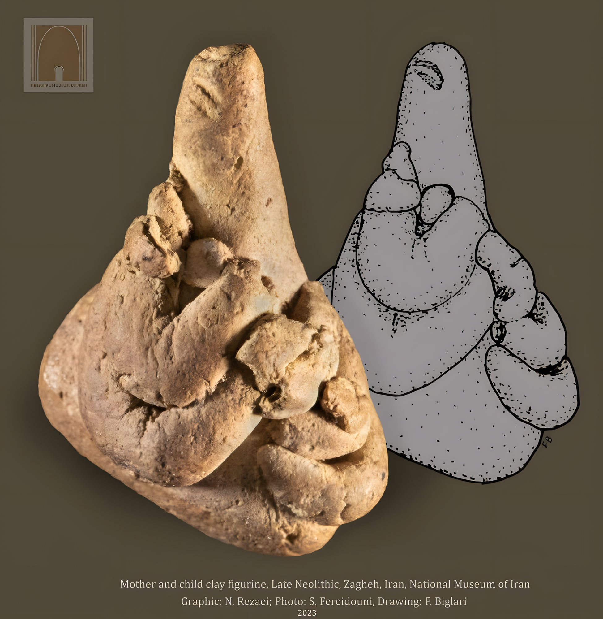 이란 카스피해에서 약 90km 떨어진 카즈빈 평원Qazvin plain 자게Zagheh (테페 자게Tepe Zagheh) 유적에서 출토된 어머니와 아이 점토 인형이다.