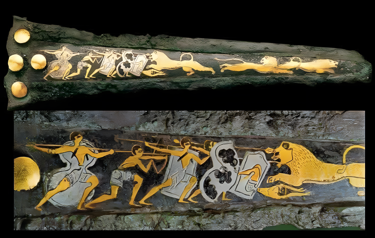 1876년 하인리히 슐리만Heinrich Schliemann이 미케네 왕릉에서 발굴한 이 "사자 사냥" 단검은 에게해 청동기 시대 가장 인상적인 상징 중 하나다.