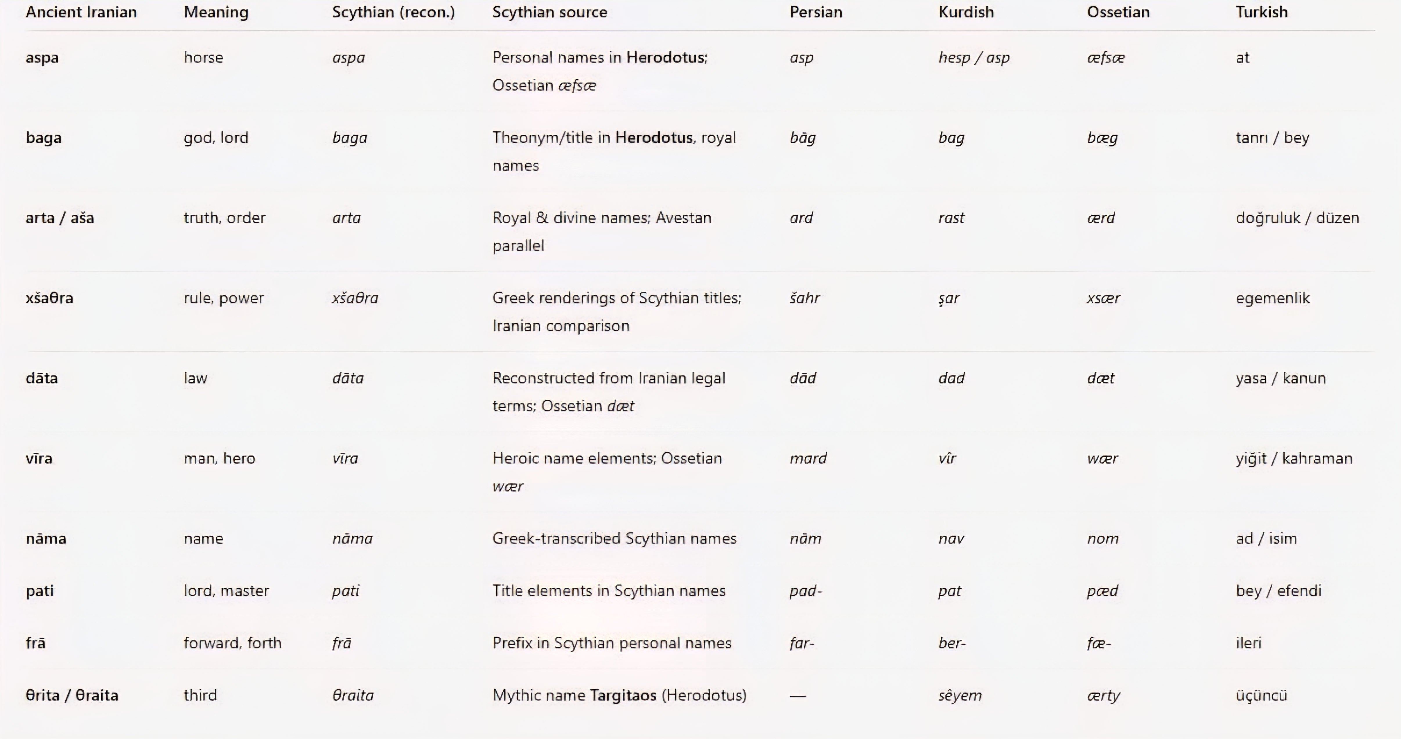 표는 스키타이어가 어휘, 이름 요소, 형태적 구성 요소에서 고대 및 현대의 입증된 이란어들과 일관되게 일치하지만 터키어와 유전적으로 일치하지 않기 때문에 이란어였음을 보여준다는 것이어니와