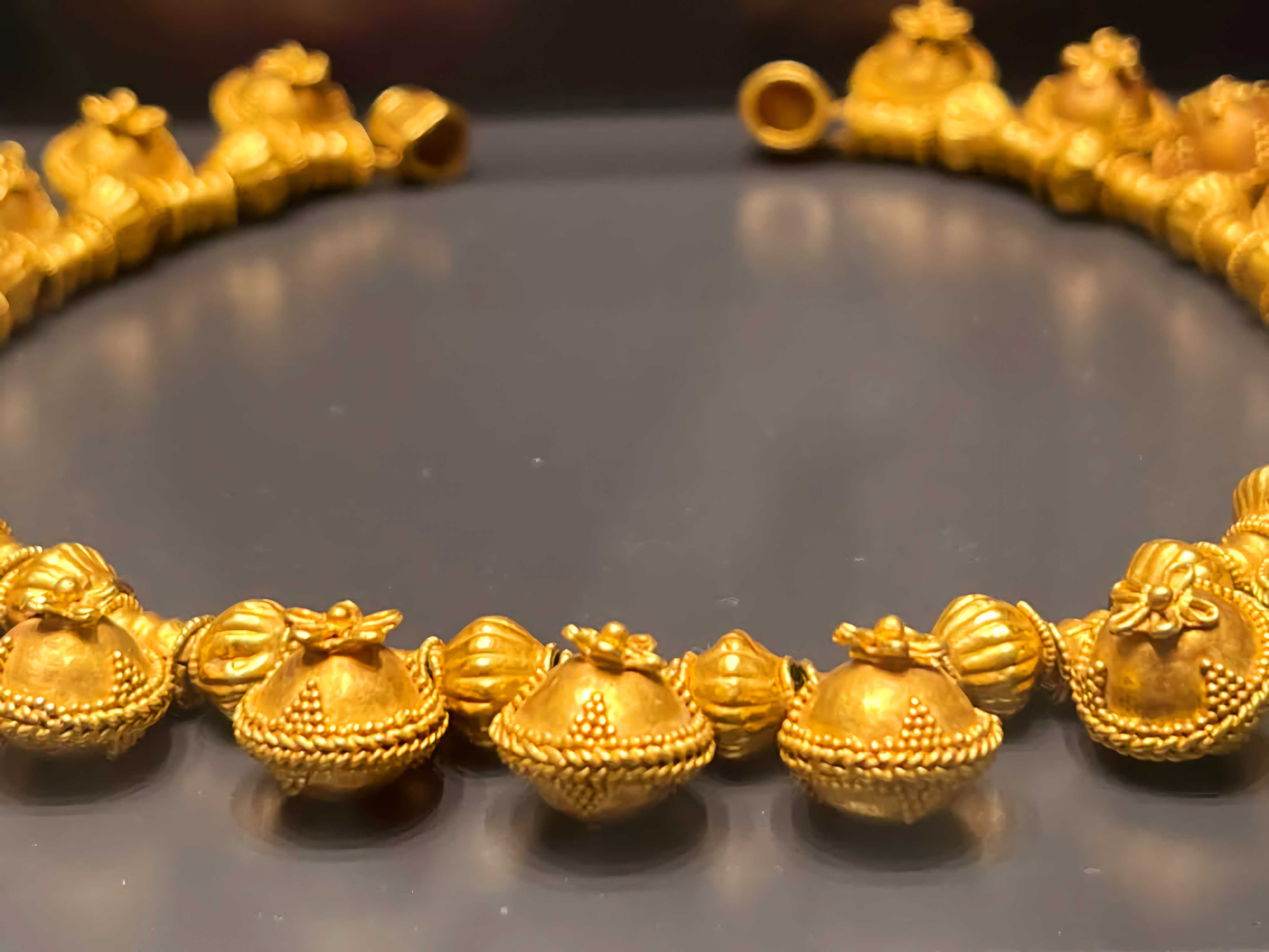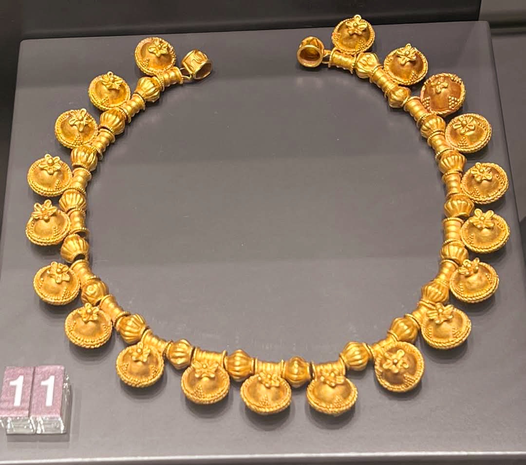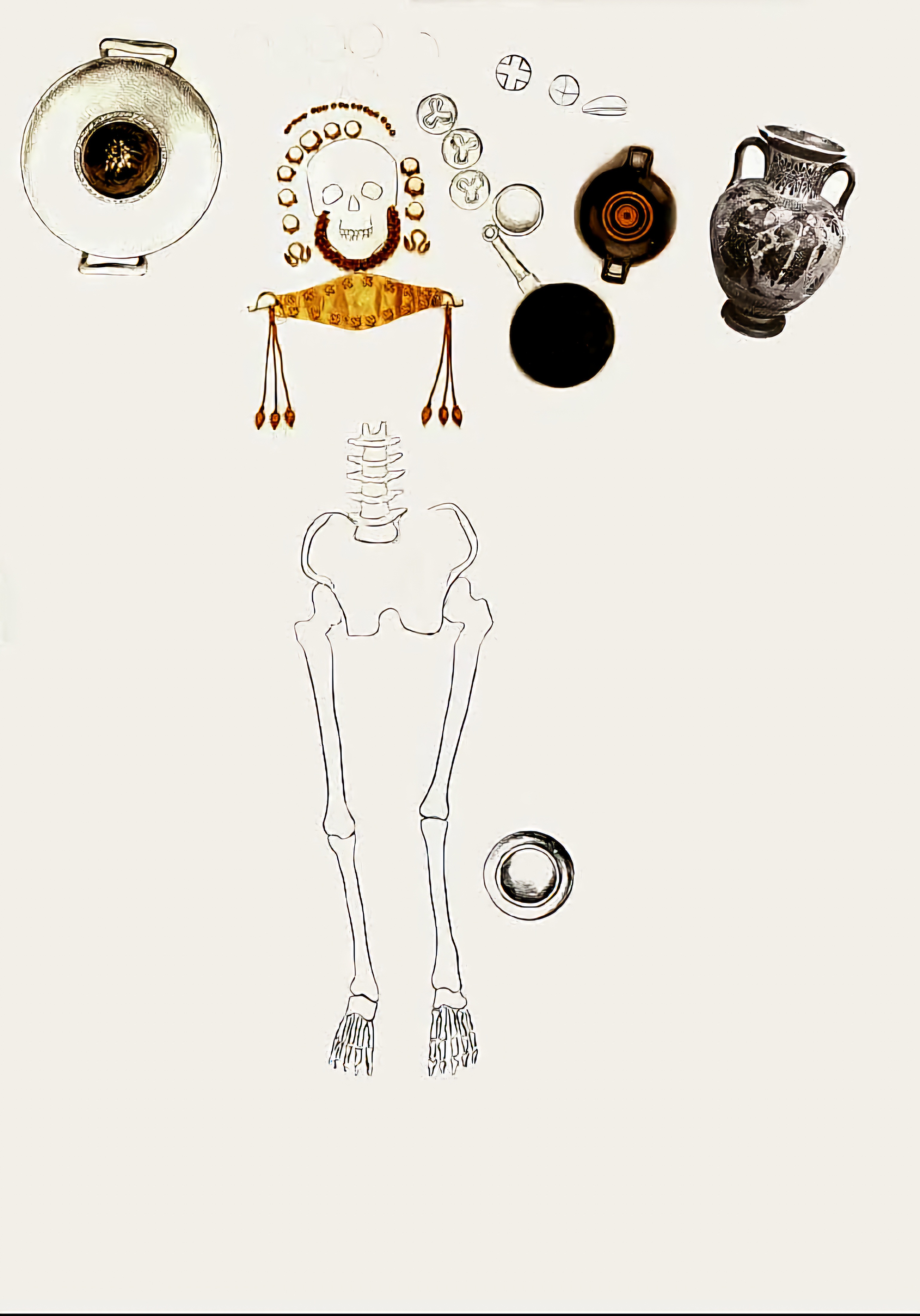 특히, 10개 금 귀걸이는 두개골 주위에 체인으로 배치되어 있다(오른쪽에 7개, 왼쪽에 3개).