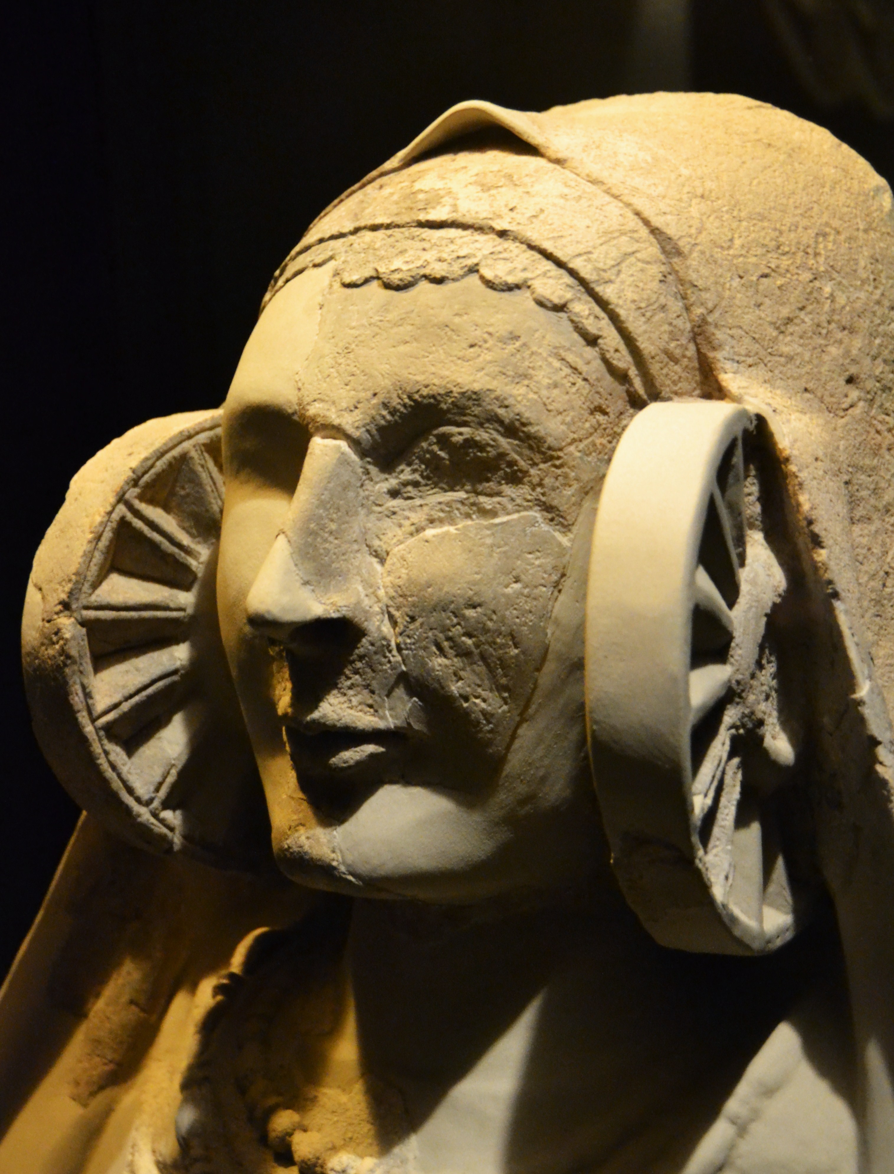 가리비 모양 머리띠 scalloped headband가 눈썹을 가로지르고 양쪽에 아마도 얇은 금속으로 만들었을 속이 빈 바퀴를 나타내는 로데테rodetes를 연결한다.