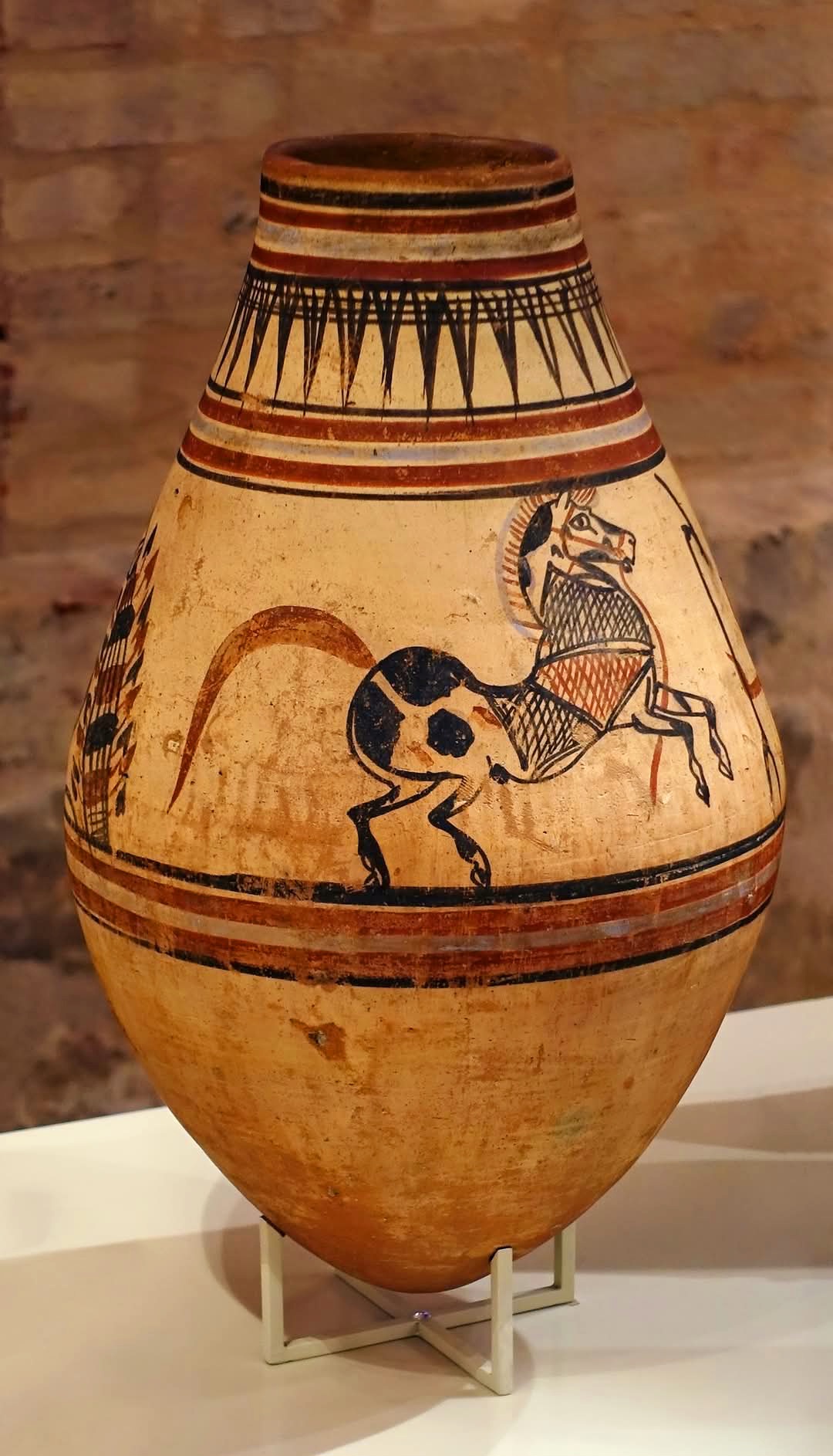 Large storage vessel, painted, illustrated with two galloping horses, Ankh sign and Was sceptre.
