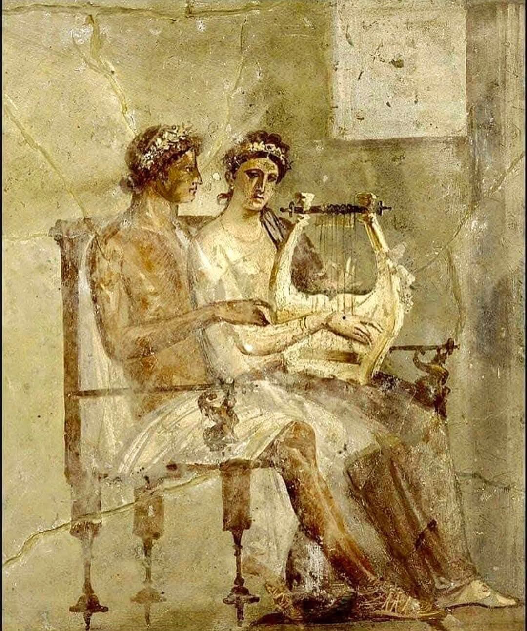The Roman fresco from Pompeii (50–79 AD) depicts a woman seated beside a man, possibly her beloved, who appears to be teaching her to play a kithara, a type of lyre.