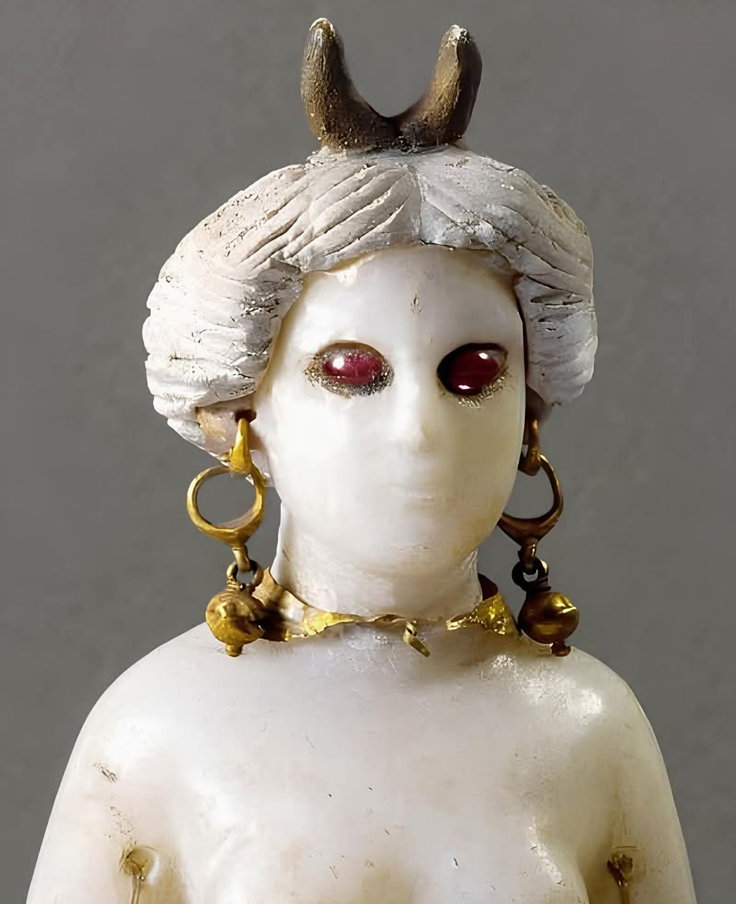 초승달 머리 장식, 금 장신구, 루비 상감 눈 등이 특징이며, 이는 모두 고대 메소포타미아 미술 특징이라 꼽을 만하다.