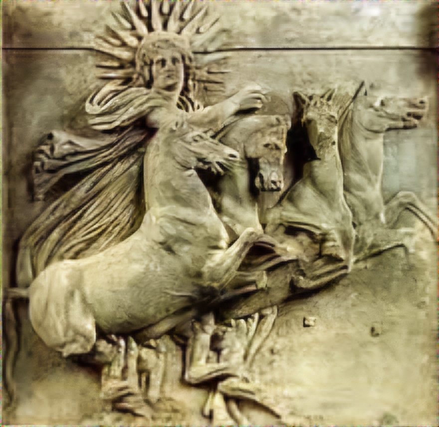 부조에는 헬리오스가 전차를 타고 바다에서 나오는 모습이 나온다.