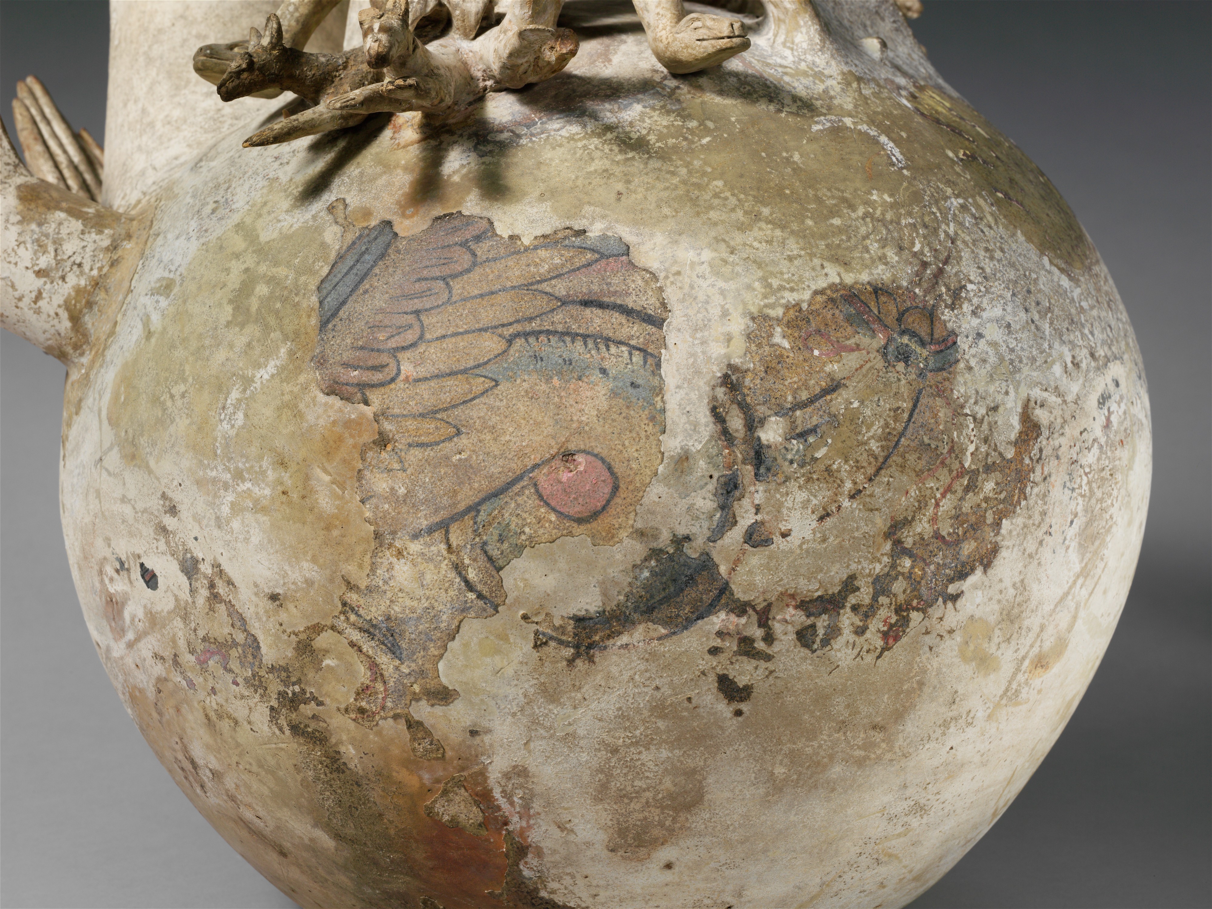 이 병 몸체에는 흰색 슬립에 분홍색과 파란색 페인트로 풍성한 색을 칠한 장식품 흔적이 남아 있다.