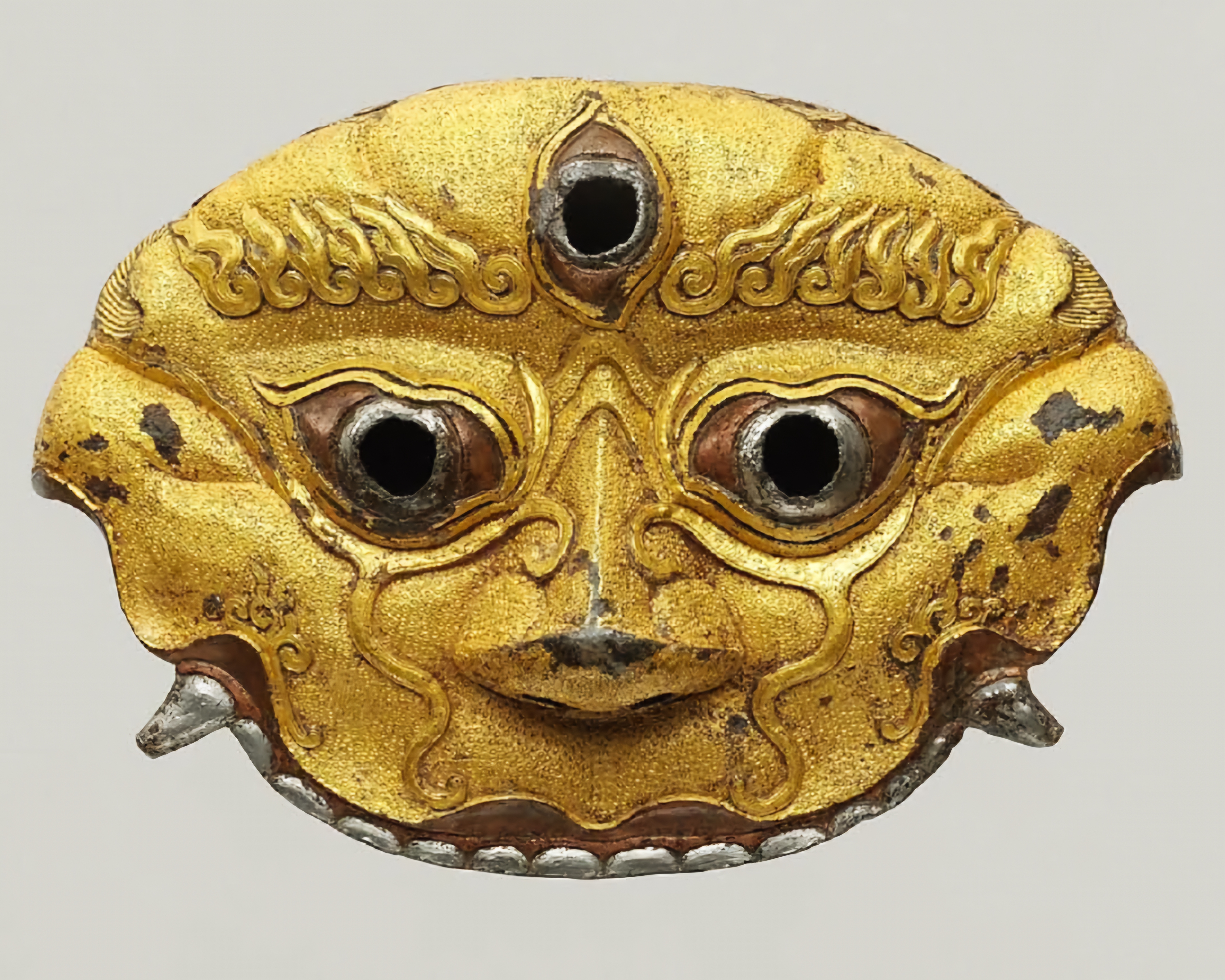 분노한 어떤 티베트 불교 수호신 얼굴을 묘사한 이 검수대는 정확한 끌질chiselling, 펀칭 기술punched work, 다마스코닝damascening이 어떤 경지에 이르렀는지를 보여준다.