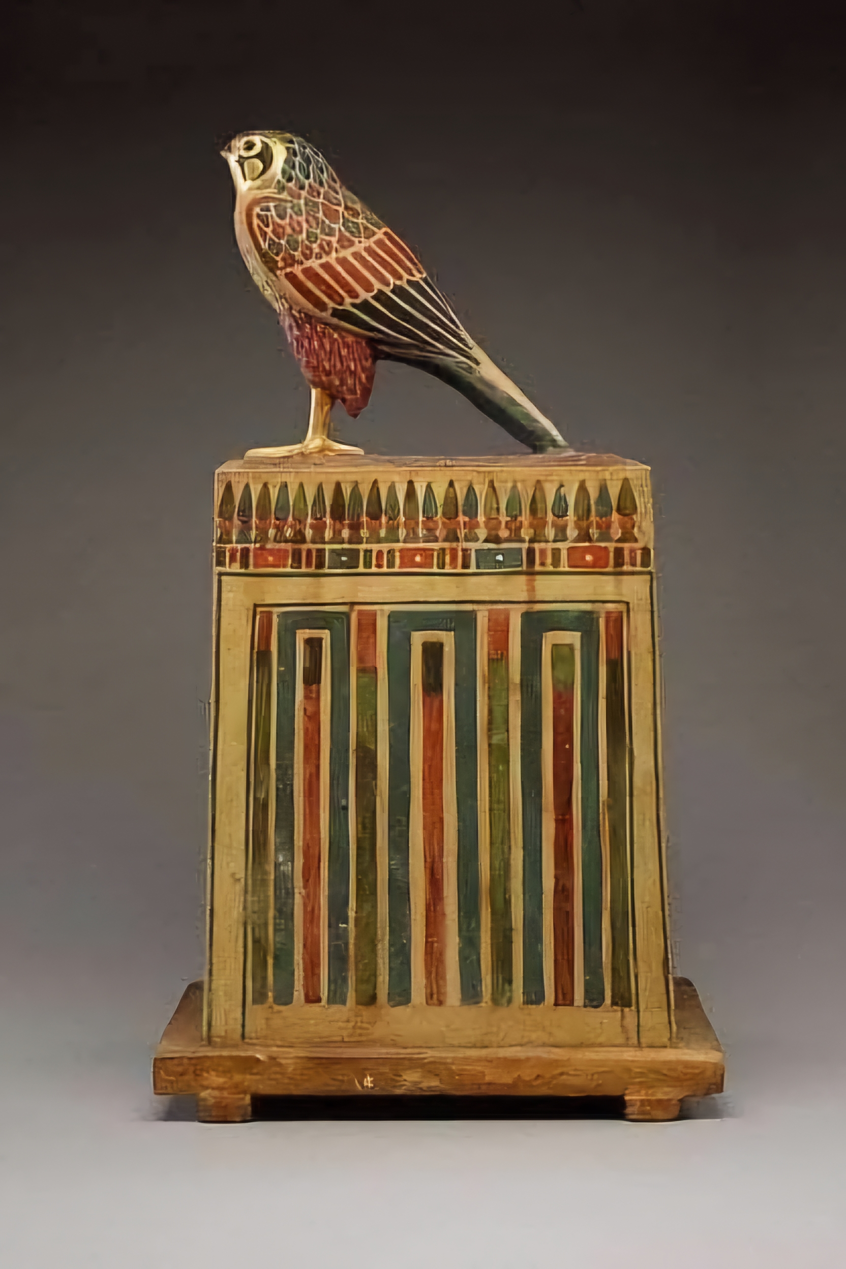 The elaborately decorated box features a falcon statuette on top of its lid. Inside is a tightly wrapped linen bundle. X-rays have shown that it does not contain a complete bird mummy but only feathers.