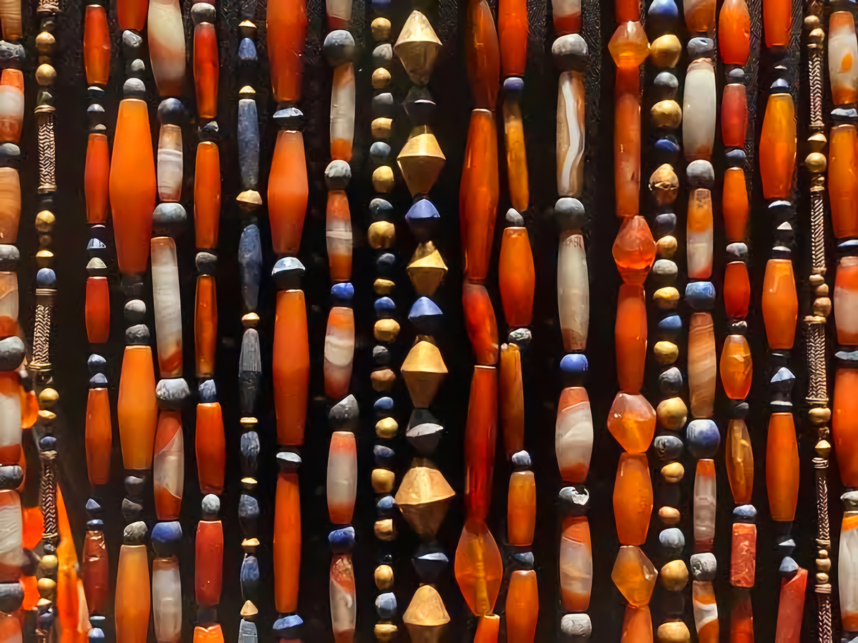 라피스 라줄리 구슬 lapis lazuli beads은 메소포타미아의 수입 석재를 사용하여 만들었으며 마노 구슬agate beads은 현지에서 제작되었거나 다른 지역에서 가져왔을 수 있다.