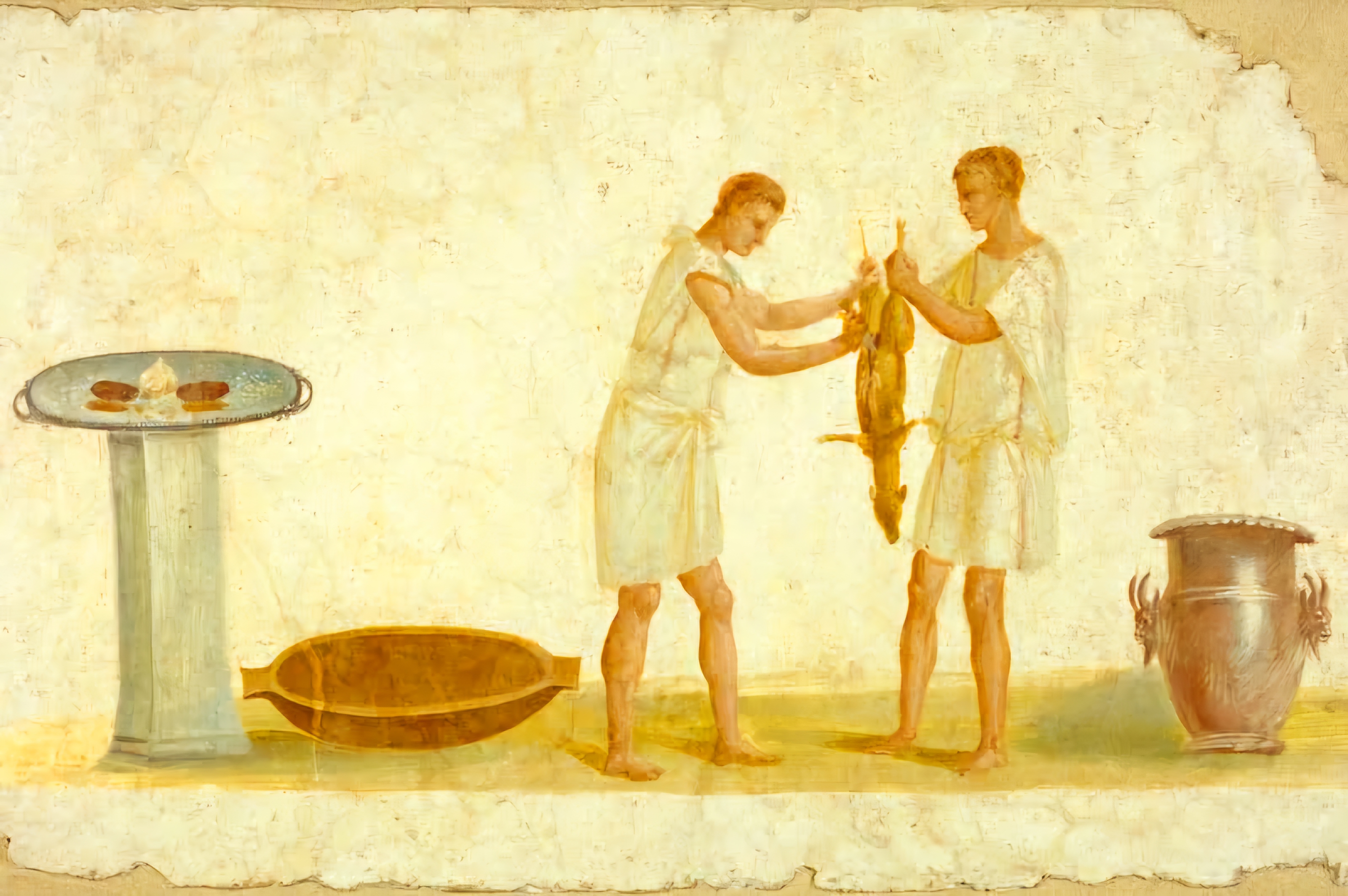 This fresco fragment depicting meal preparation dates back to 1-79 AD and is on display at the Getty Museum.