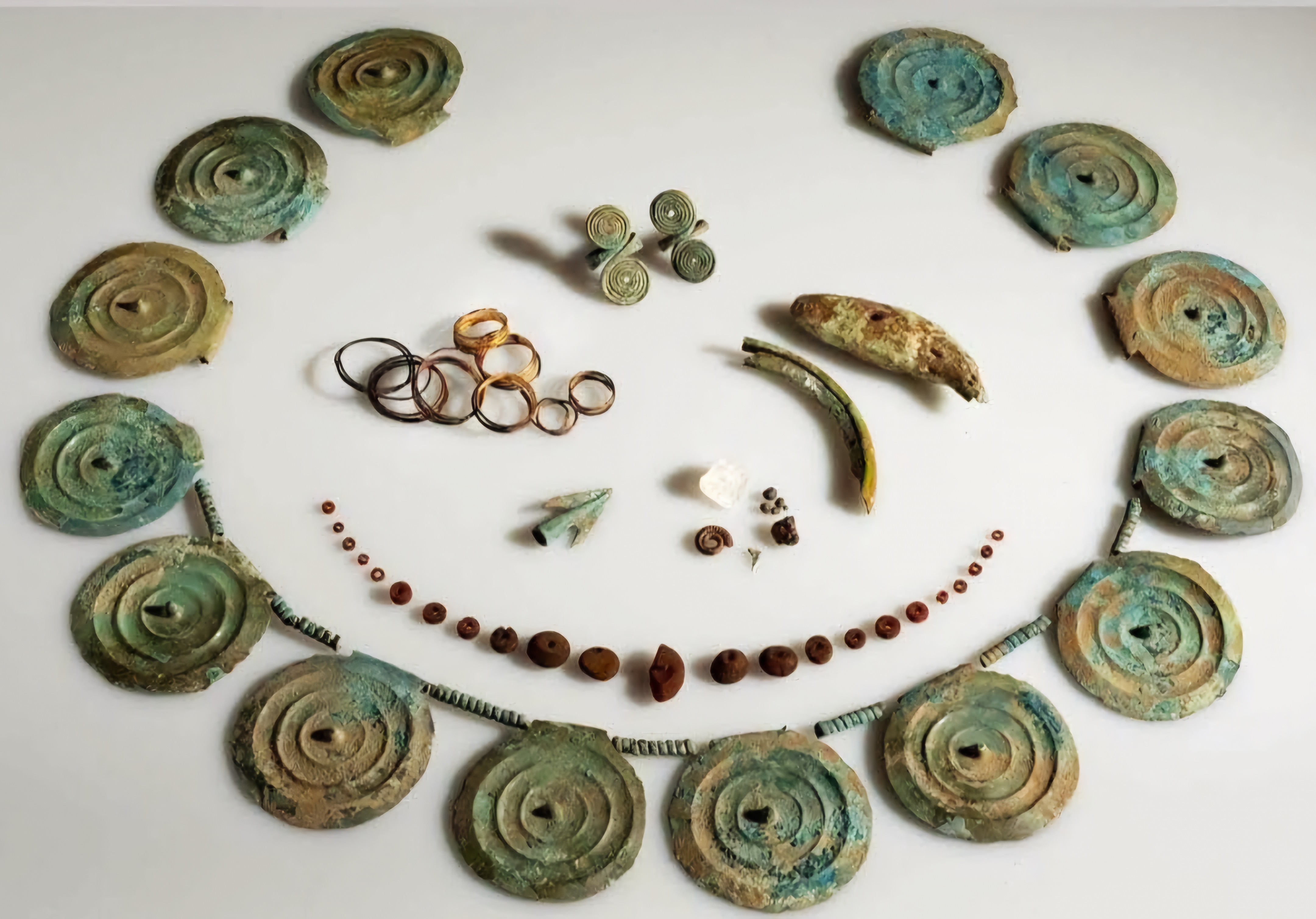 기원전 1500년으로 거슬러 올라가는 이 세트는 청동 원반bronze discs, 두 개의 나선형 고리spiral rings, 핀헤드pinhead 크기 작은 호박 구슬 amber beads 100개 이상으로 구성된 목걸이가 특징이다.