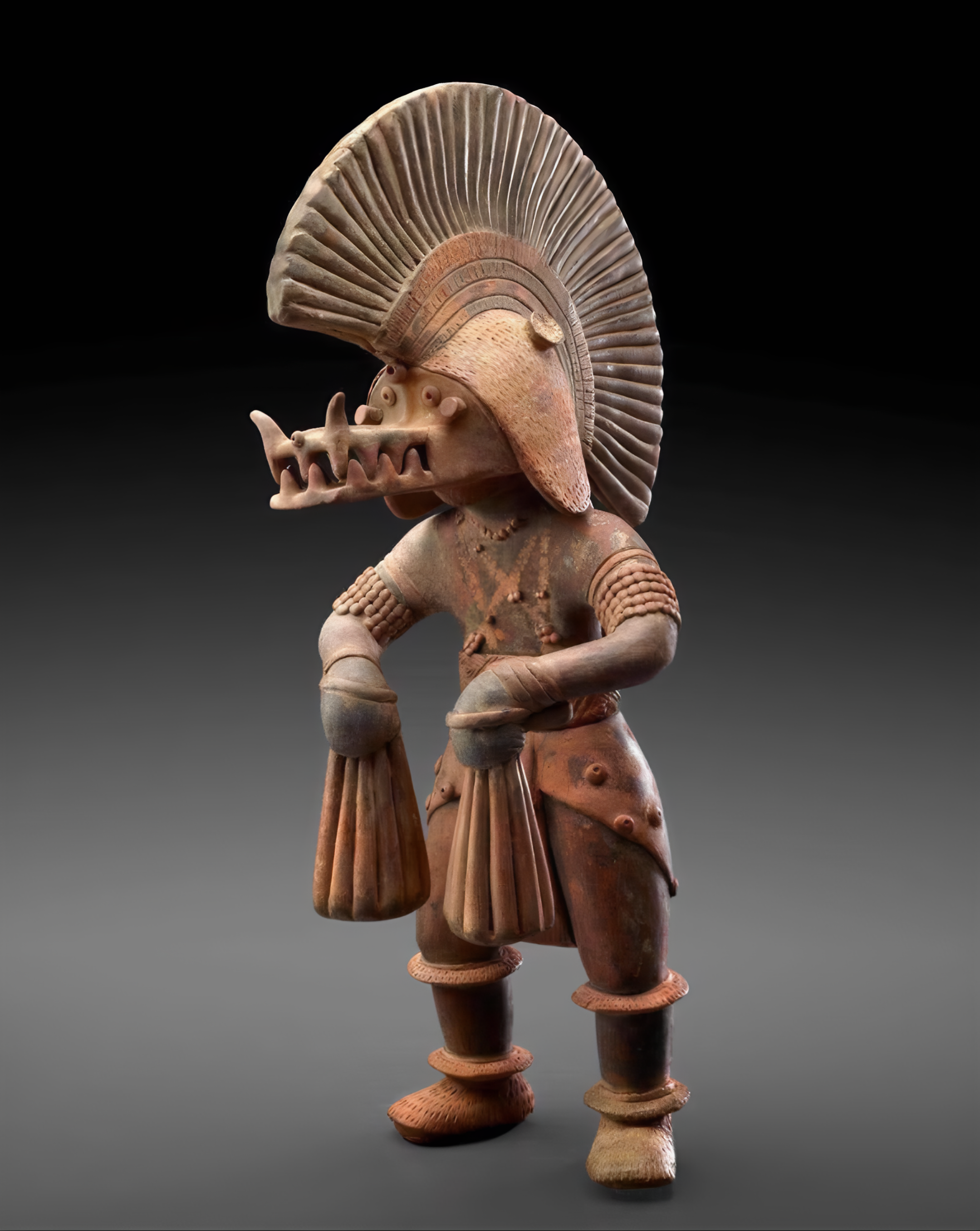 A ceramic figure representing a dancer with a removable crocodile helmet from the Colima culture.