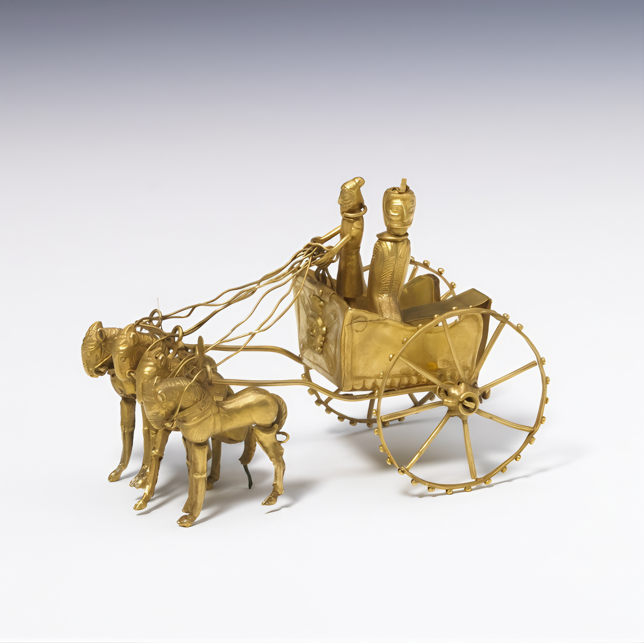 The driver wears a similar cap without a fillet, a short girded tunic and a wire torc; his legs are also formed of wires. The two human figures are fixed to the chariot by wires.