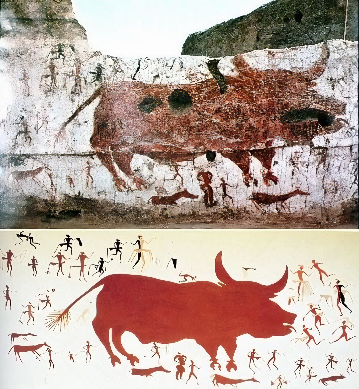터키 차탈회위크Çatalhöyük 유적에서 확인된 사냥꾼이 쫓는 붉은 황소를 그린 벽화다.