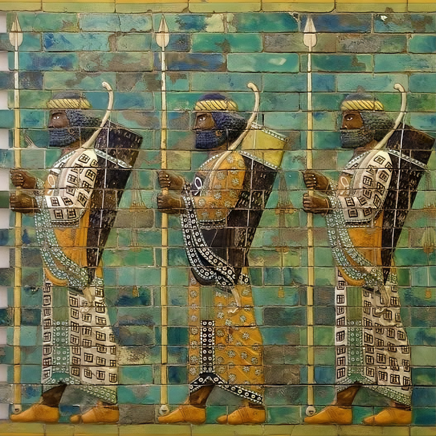 A frieze made of glazed brick tiles depicting persian warriors, from the palace of Darius l in Susa, Iran. Achaemenid Empire, 6th century BC, now on display at the Pergamon museum in Berlin