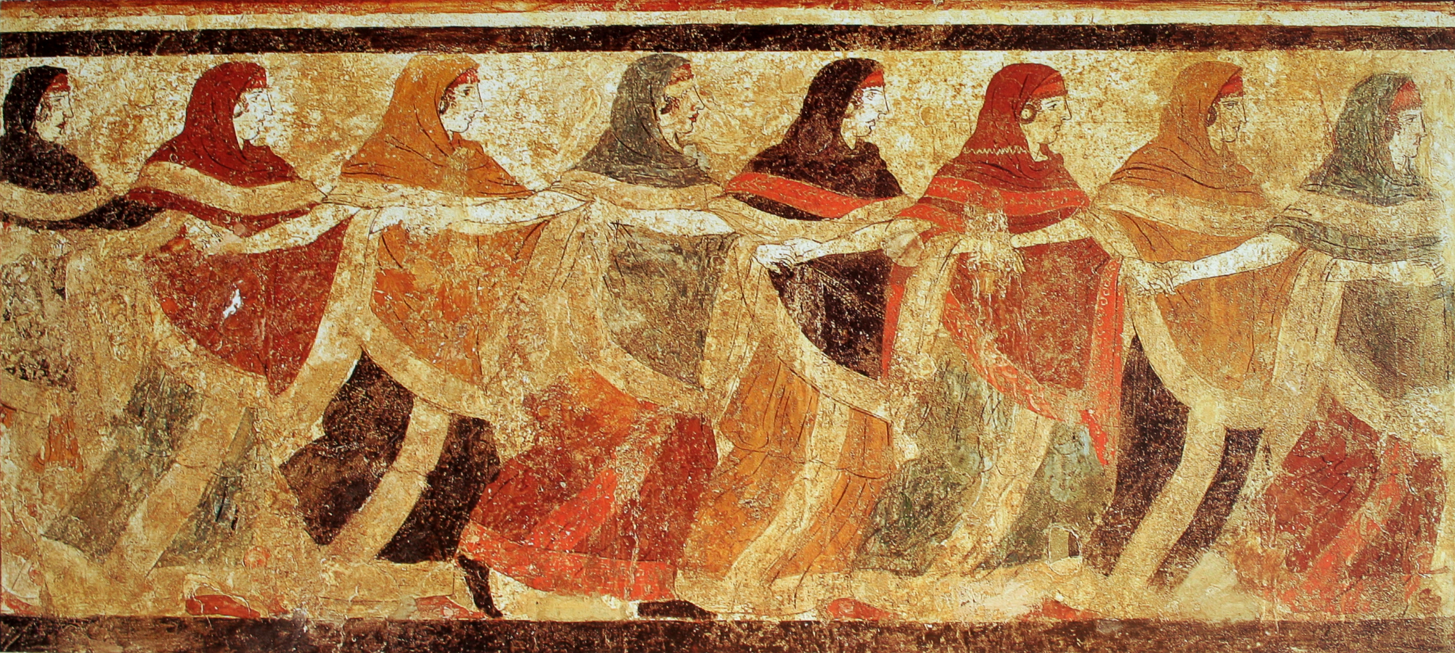 6개 그림 패널에는 30명 이상을 헤아리는 춤추는 여성이 보이며, 마치 무덤 내부를 중심으로 원을 그리며 춤추는 것처럼 팔을 맞잡고 왼쪽에서 오른쪽으로 움직인다.